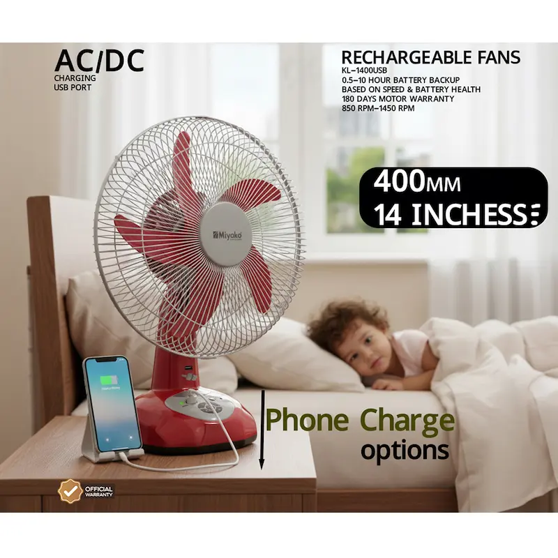 🌀 Miyako KL-1400USB Rechargeable 14 Inch Fan – Long Backup, Low Noise & Powerful Airflow