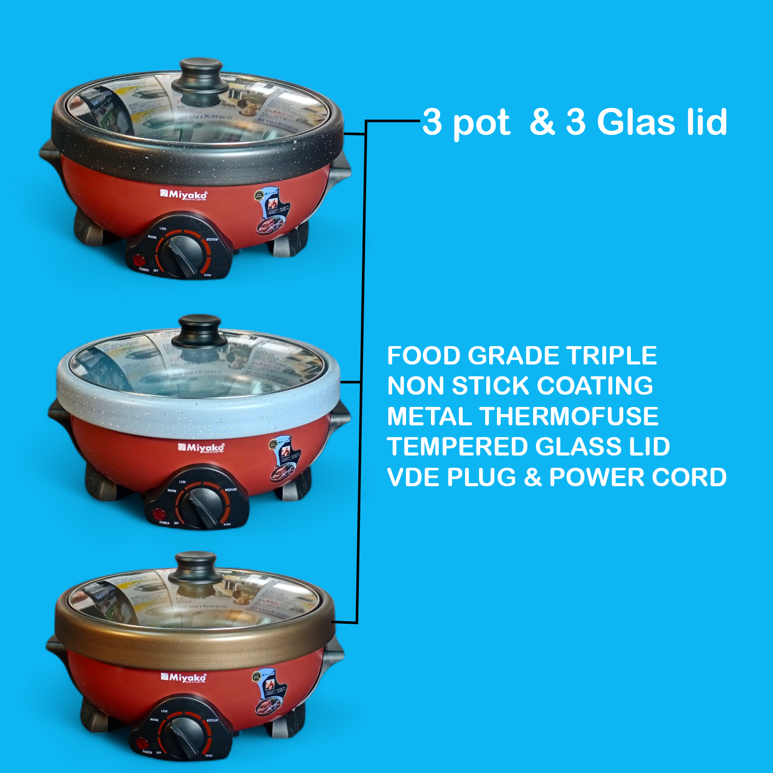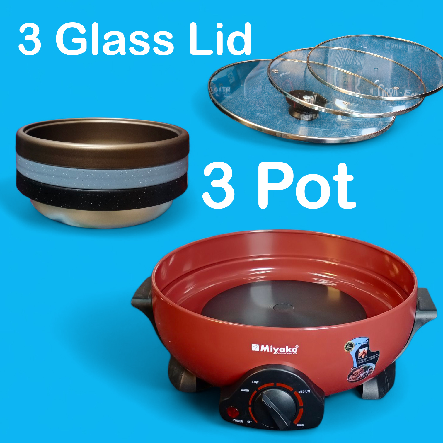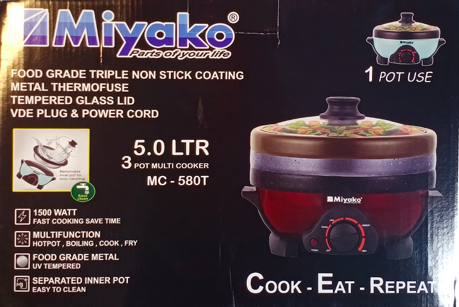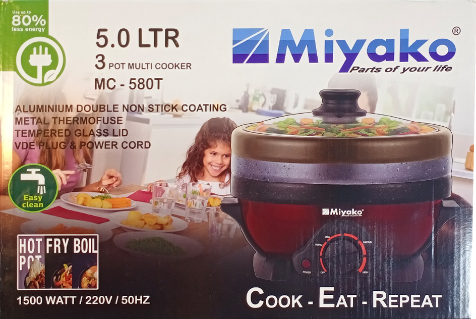 The Miyako MC-580T 3 Pot Multi Cooker is a powerful and versatile kitchen appliance designed to make everyday cooking faster and easier. With a large 5.0-liter capacity and 1500W high power, this multi cooker ensures quick heating and efficient cooking for families.