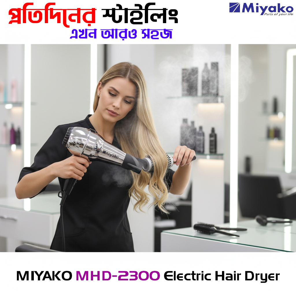 Miyako MHD-2300 Professional Hair Dryer একটি শক্তিশালী এবং দ্রুত চুল শুকানোর জন্য ডিজাইন করা হয়েছে। এতে রয়েছে ১৮০০ ওয়াট ক্ষমতাসম্পন্ন AC Professional Motor, যা দ্রুত এবং কার্যকরভাবে চুল শুকাতে সাহায্য করে।
