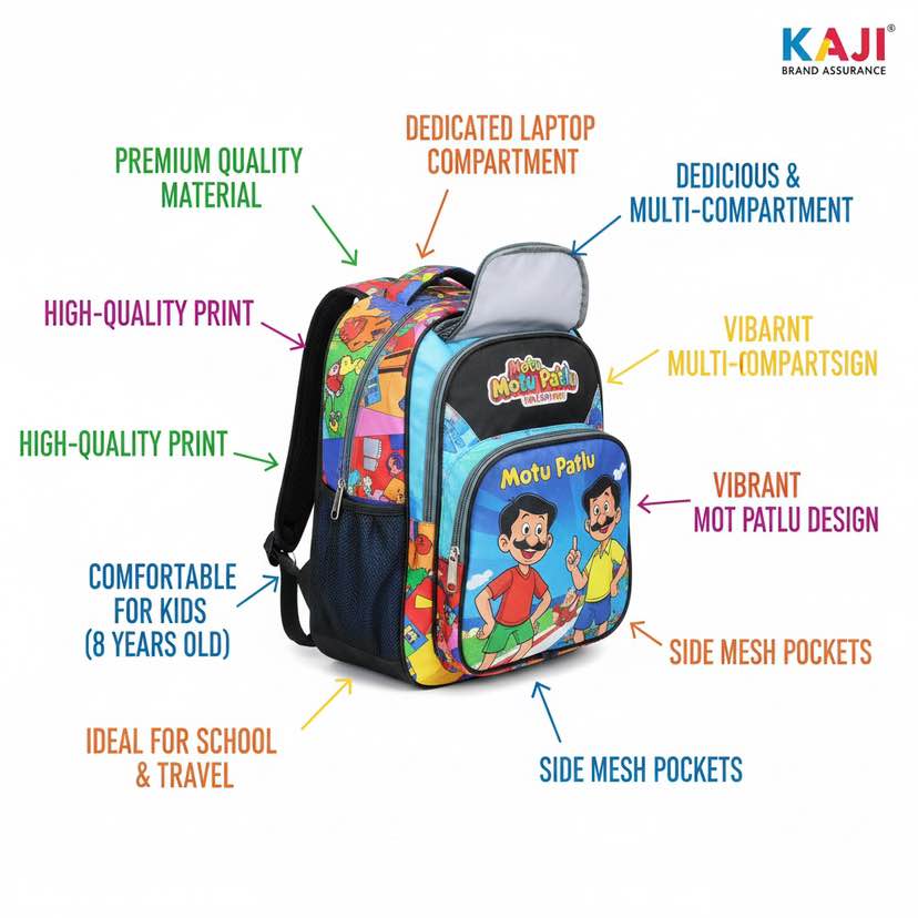 This Kazi Brand Motu Patlu Kids Backpack is the perfect companion for 8-year-old boys and girls! Featuring a vibrant, high-quality print of their favorite characters, it's designed with premium, durable material for long-lasting use. The bag offers a spacious, multi-compartment interior, including a dedicated laptop slot, ensuring all essentials are organized. With comfortable, adjustable straps and convenient side mesh pockets, it’s ideal for school, travel, and everyday adventures. Give your child the joy of carrying their favorite Motu Patlu bag!