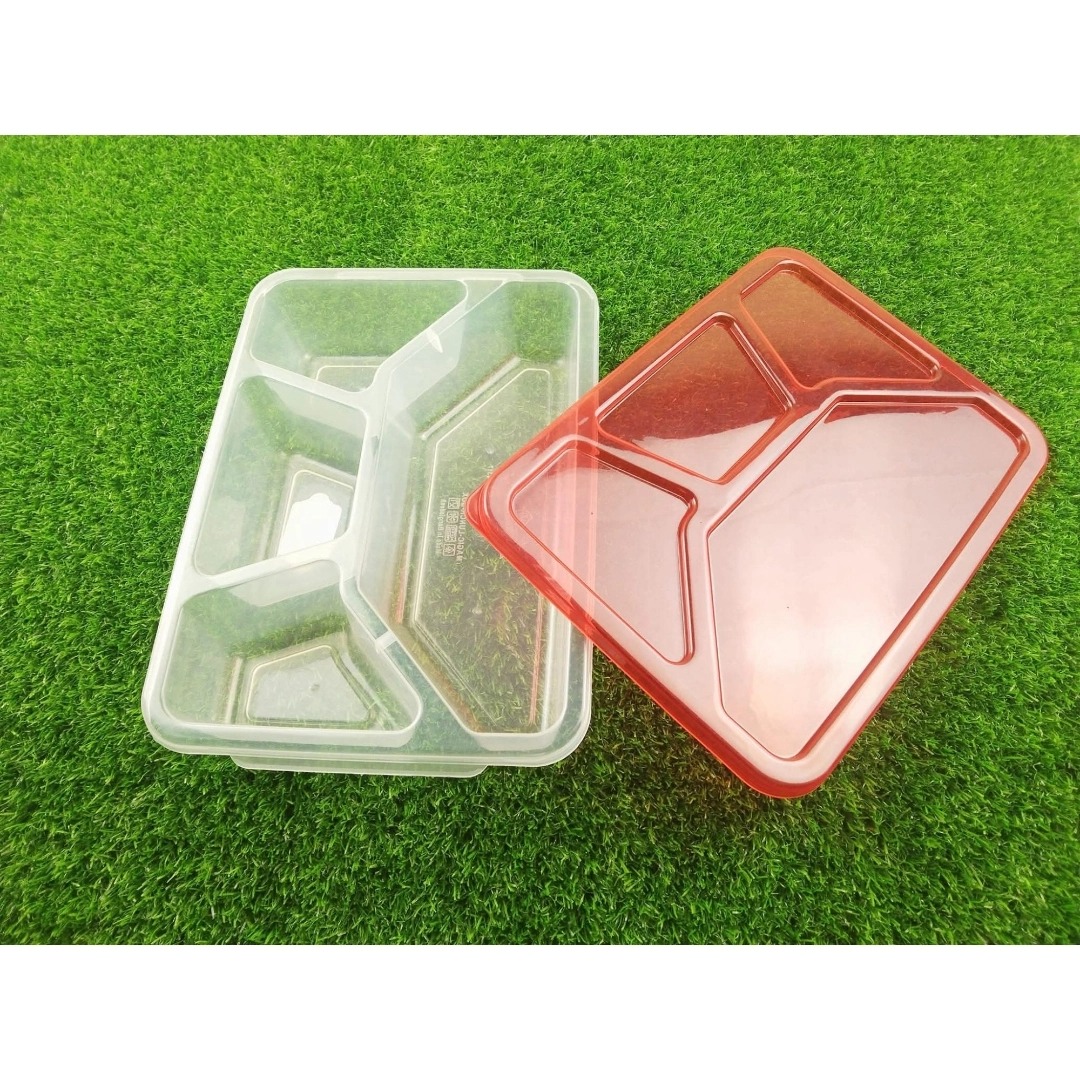 The **Multi-Compartment Lunch Box** is a premium plastic bento meal tray designed for modern food delivery and catering services, offered in a value pack of 25 pieces per carton. Each tray features multiple partitions that neatly segregate different meal items, ensuring freshness and preventing flavor mixing during transport. Crafted from high-quality, food-grade plastic, these boxes are lightweight yet sturdy, ideal for safe delivery of complete meals or assorted snacks for offices, events, or school lunches.
