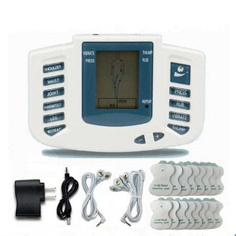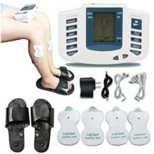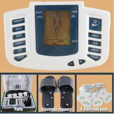 Product Type: Electrical Full Body Relax Muscle Massager , Pulse Tens Acupuncture Therapy with Slipper massager, Perfect for pain removal at waist, shoulders, legs, foot massage and physical therapy do the physical therapy for the four parts of your body at the same time, 4Electrode pads, Made in china, 1 year Company service warranty, 4 therapeutic modes: Vibrate, Thump, Rub, Press, Color: White/ off white, Digital display meterwithtreatment guide, Uses the infrared physical therapy electrodes, Improves your body circulation, relieves your pain and promotes your metabolism. 8 stepsmassage power levels, Comes with two pieces of massage electrodes, a charger, a electrode wire, and a pair of shoes.