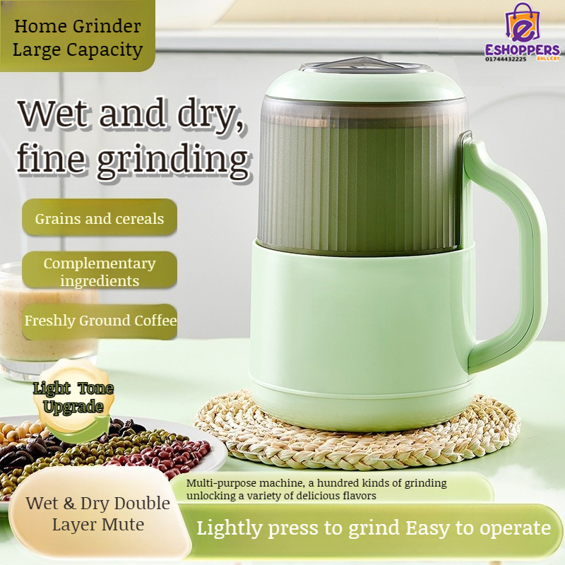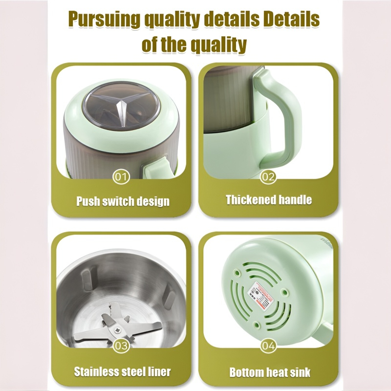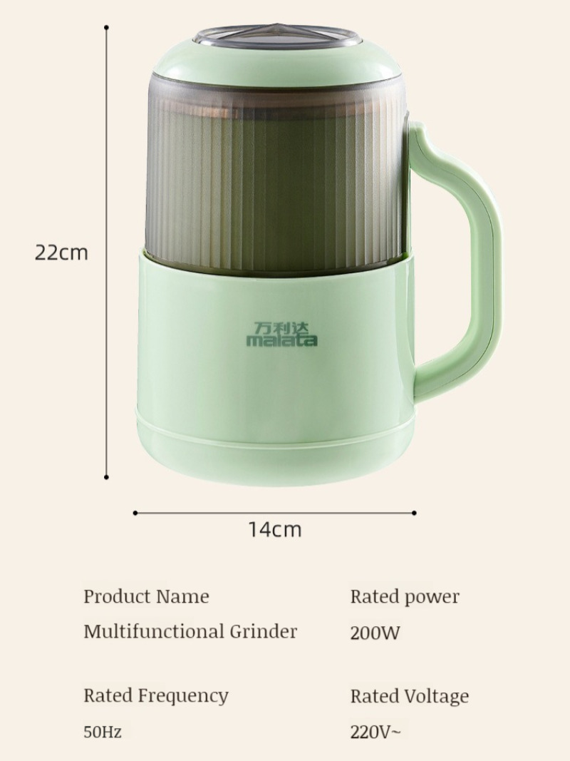 Product name: Multifunctional grinder(Wet and dry). Size: 22cm*14cm*14cm. Capacity: 1000ml. Rated frequency: 50Hz. Rated power: 500W. Rated voltage: 220V. Rotation speed: 70000rpm. Switch control: press the switch. Plug:EU Plug. Material: 304 stainless steel +ABS. Mode of operation: semi-automatic. Stainless steel 10-blade blade. 304 food grade stainless steel material.