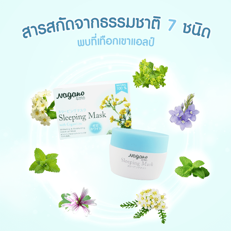 Nagano Sleeping Mask with a natural ingredient of Gigawhite, the best combination of 7 natural plants growing in the ALPs, is a powerful restoring treatment leave-on mask while sleeping that addresses visible signs of whitening and skin rejuvenation due to a high of anti-oxidant and moisturizing property. It contains natural ingredients of Gigawhite and Collagen that help in skin-lightening activity, reduction of age spots color intensity, evening of your skin tone, creating collagen and elastin for your skin. Leaves your skin with a velvety radiance, younger look and moisturizing for all day.