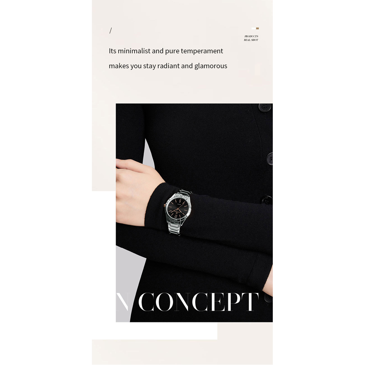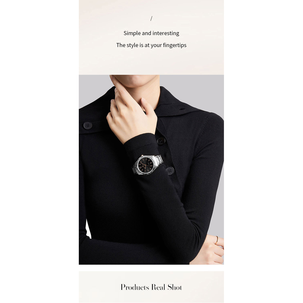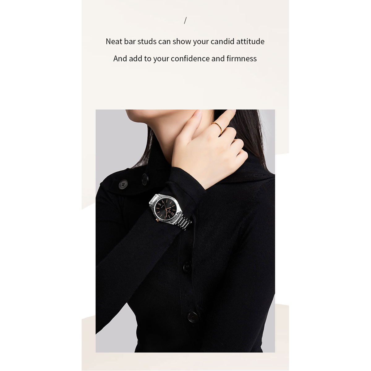 ◉ Design concept:A classic round dial with simple silhouette Shows your neat and candid attitude. Studs are outlined with clear and powerful linesThat complement the metallic case so you can walk around the city with ease.