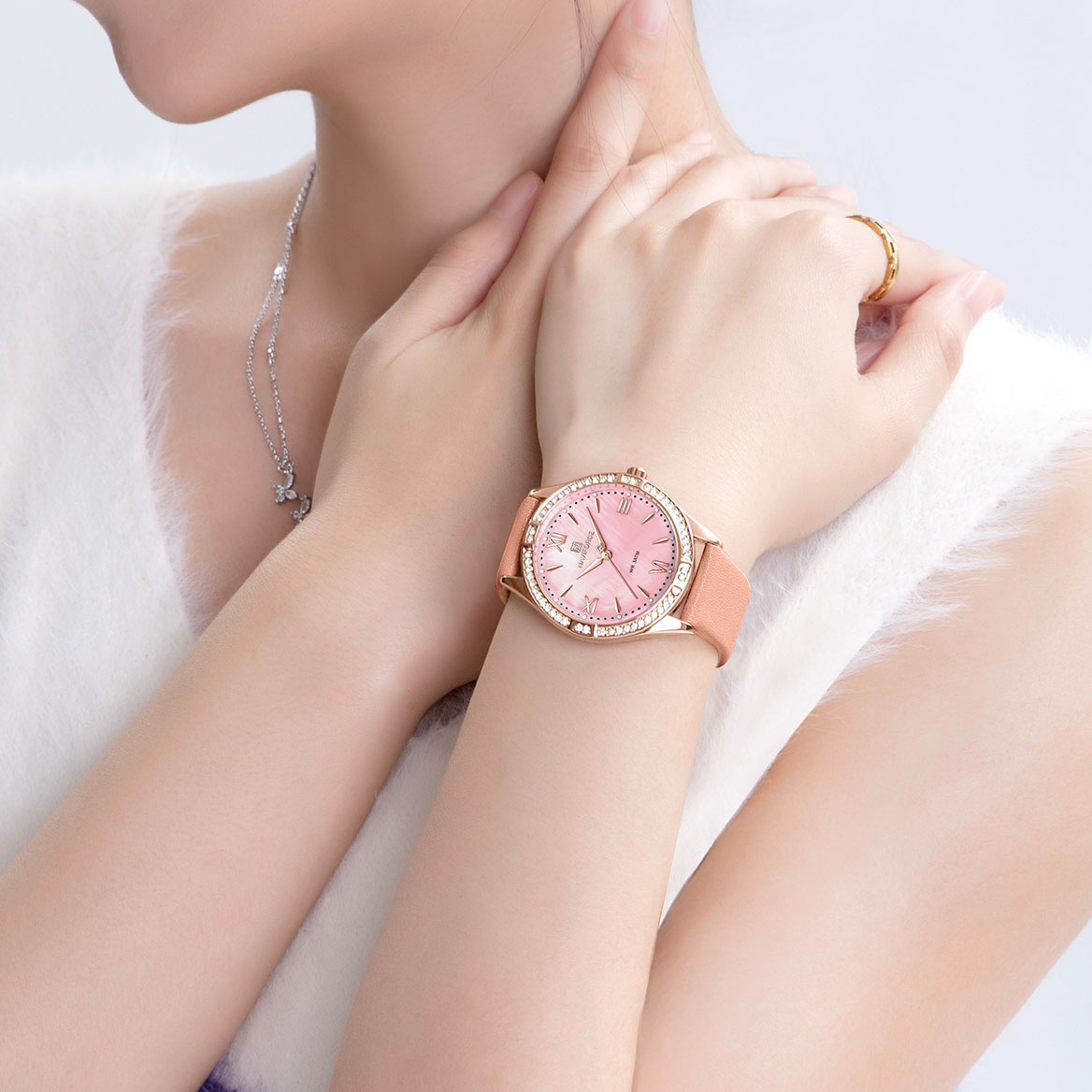 ◉ DESIGN CONCEPT:Sparkling crystal-diamond-set bezel reflecting light,The clean and unique mother-of-pearl dial,Brings out your beautiful and gentle tone,With a captivating and elegant color scheme,It awakens your romantic sensual imagination;