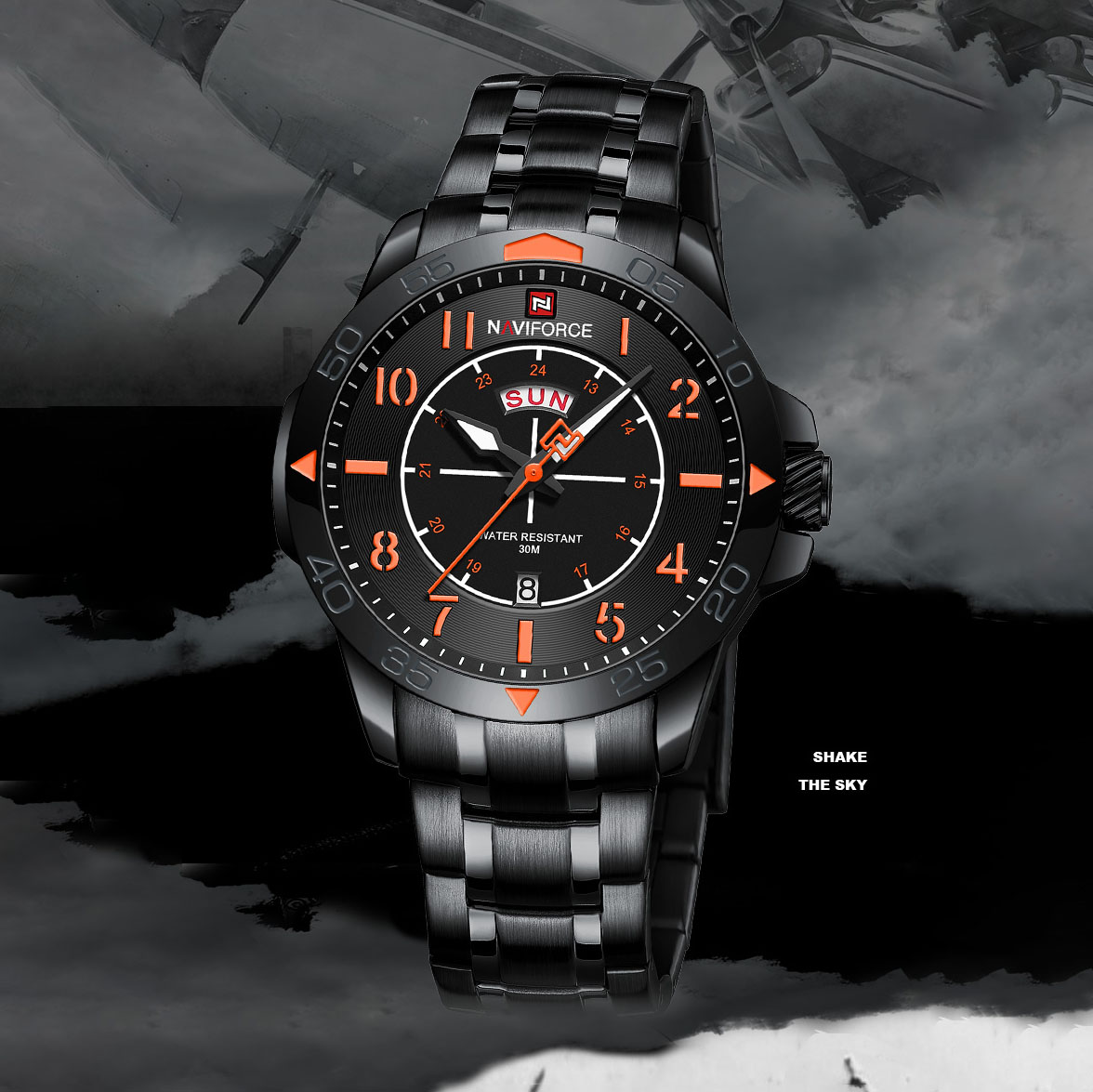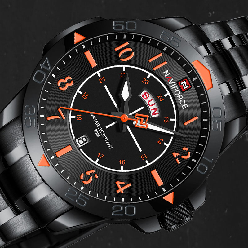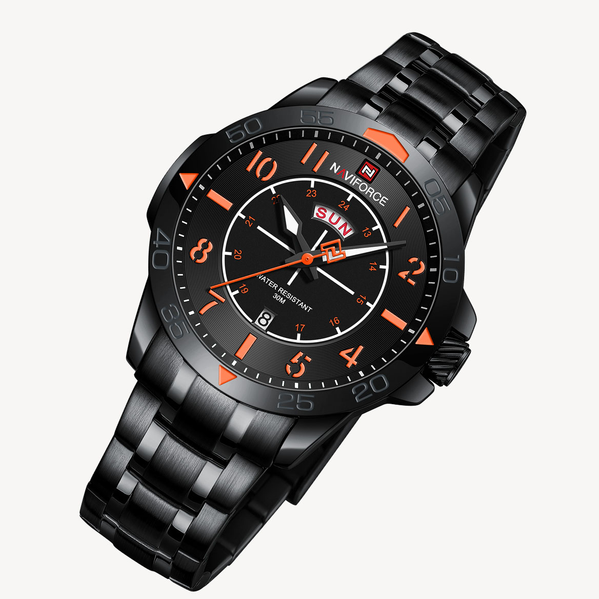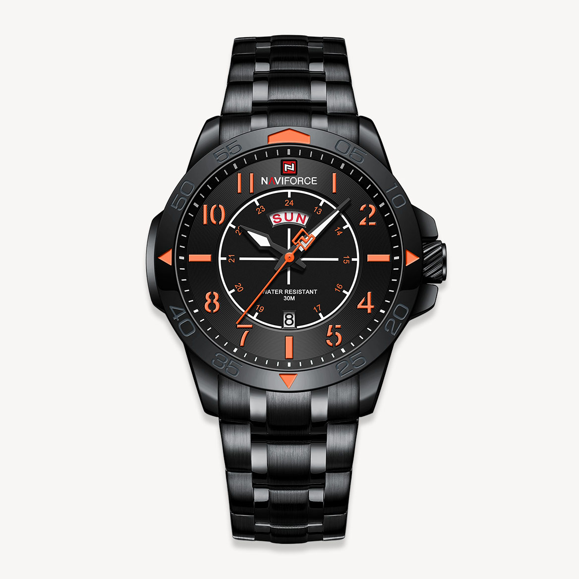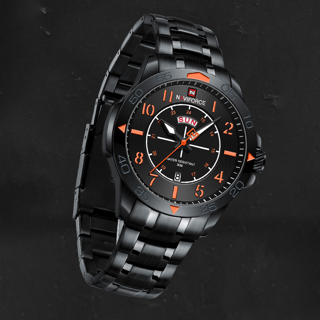 NAVIFORCE NF9204 Black Stainless Steel Analog Watch For Men - Orange & Black