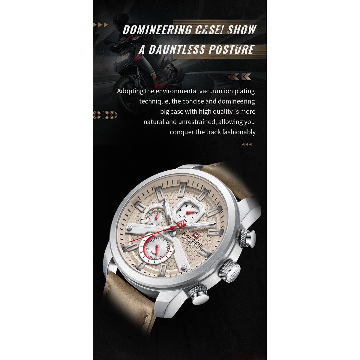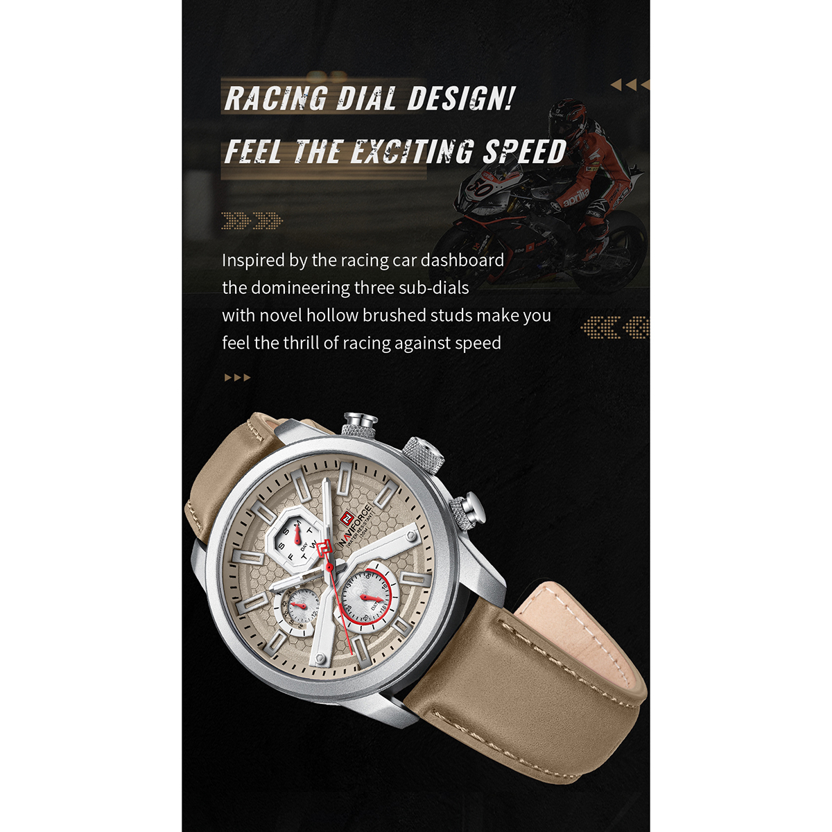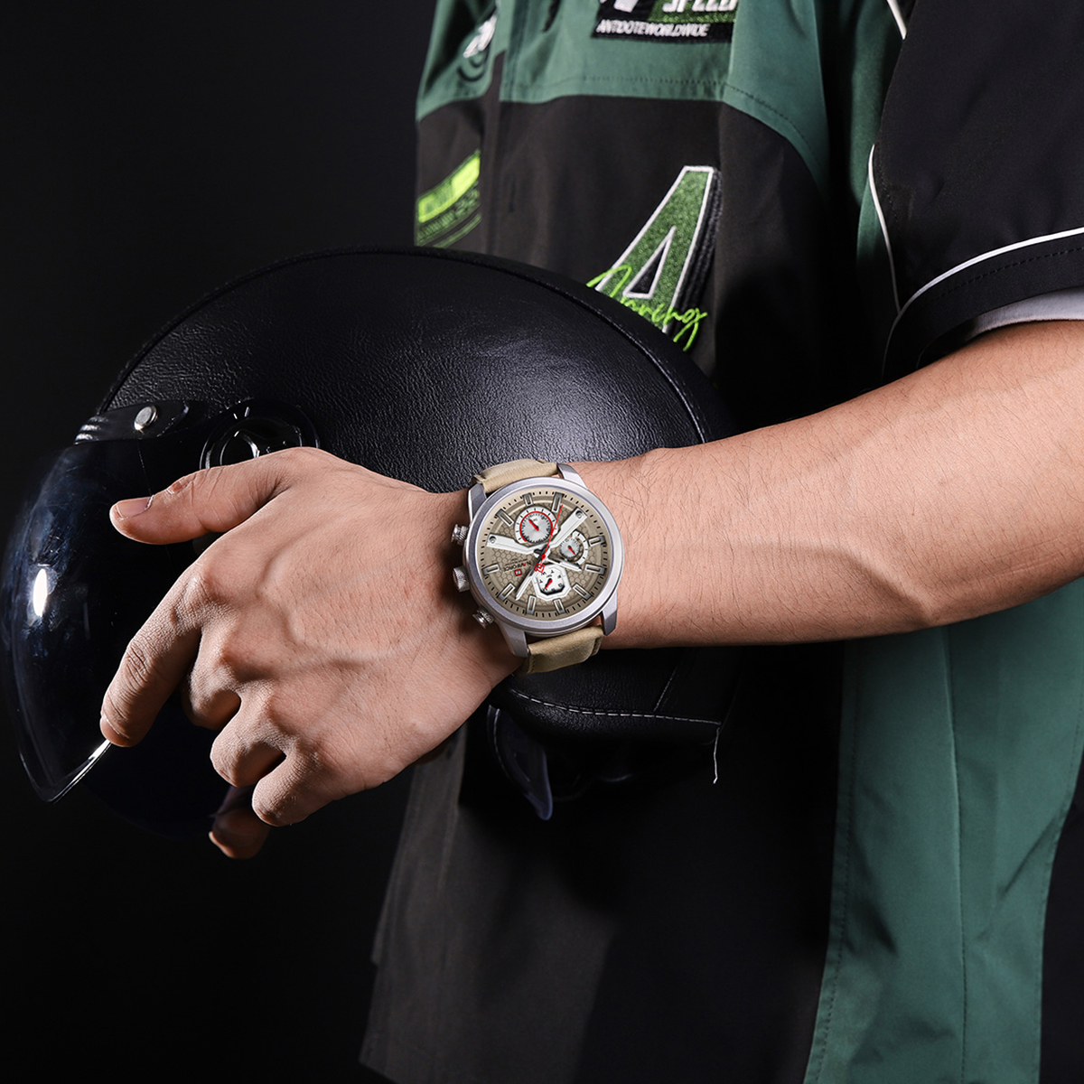 ◉ RACING DIAL DESIGN! FEEL THE EXCITING SPEED Inspired by the racing car dashboard, the domineering three sub-dials with novel hollow brushed studs make you feel the thrill of racing against speed.