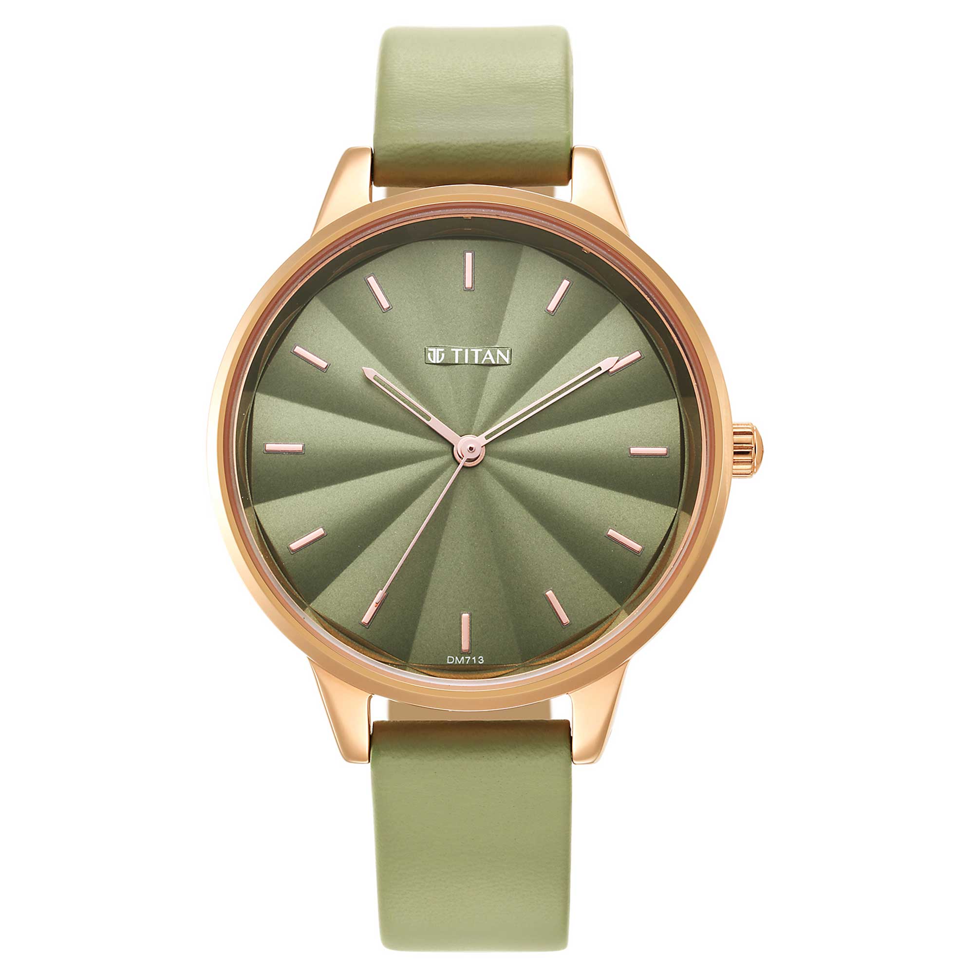 Titan Neo for Ladies with Green Leather Strap , Mineral Glass Glass , Grey Dial Colour , Round P3H Quartz Case , Case Size: 36.50 mm Width 43.50 mm Length 8.20 mm Thickness with Buckle Lock , Water Resistance : 5 ATM