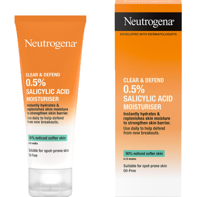 Neutrogena® Clear & Defend 0.5% Salicylic Acid Oil-Free Moisturiser is clinically proven to help prevent spots and fade spot marks while respecting the skin’s natural balance, for a smoother, clearer complexion.