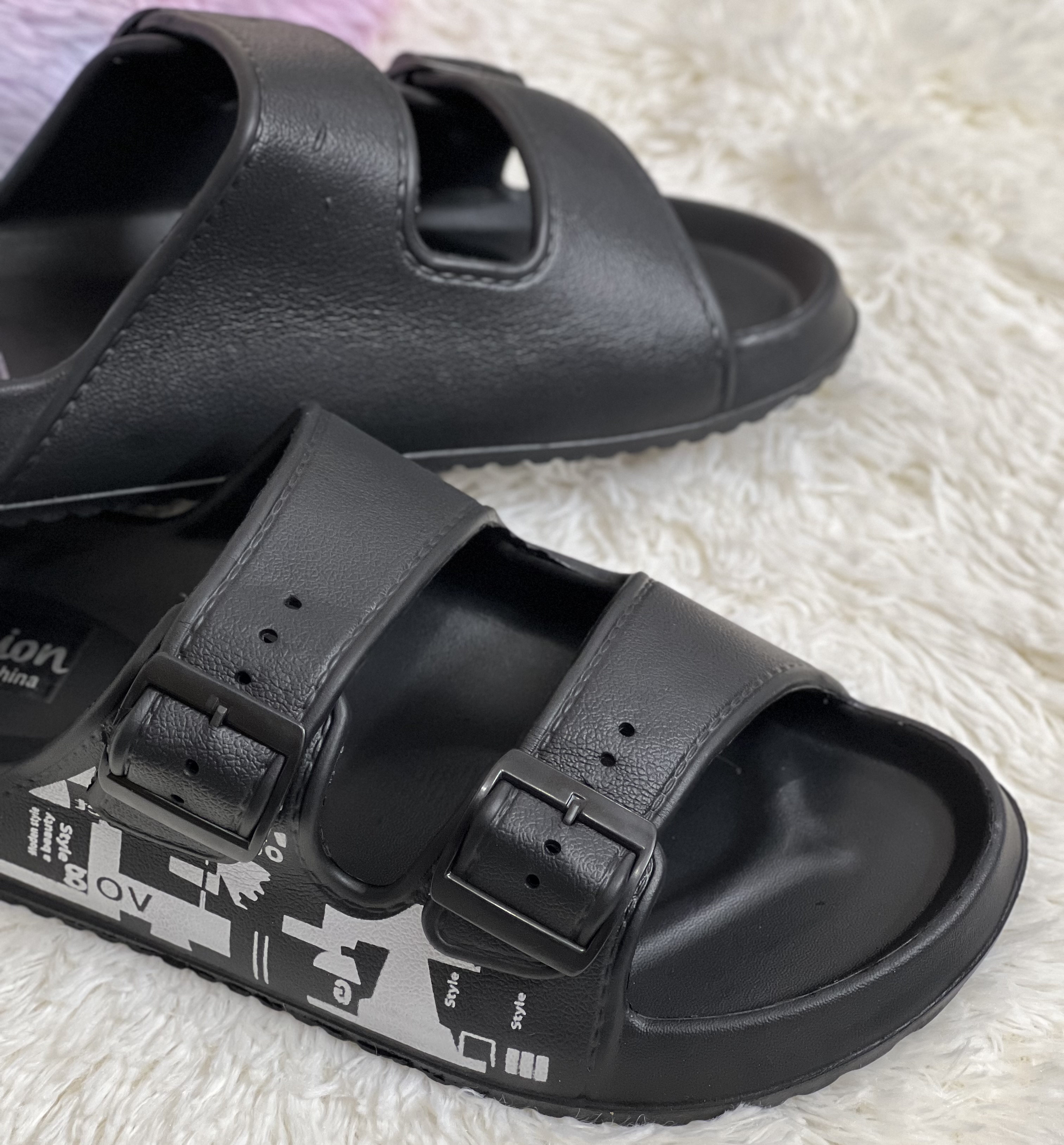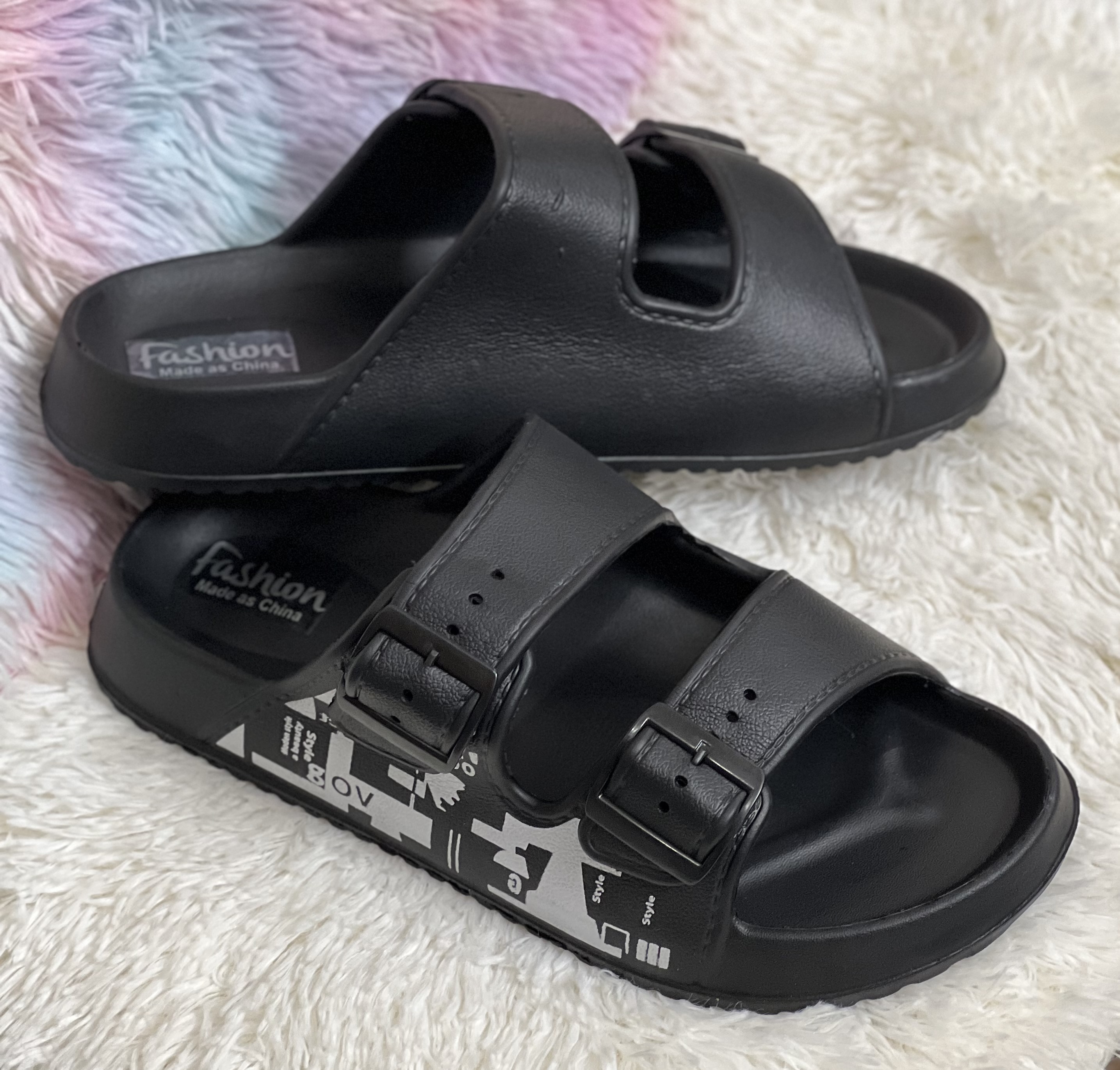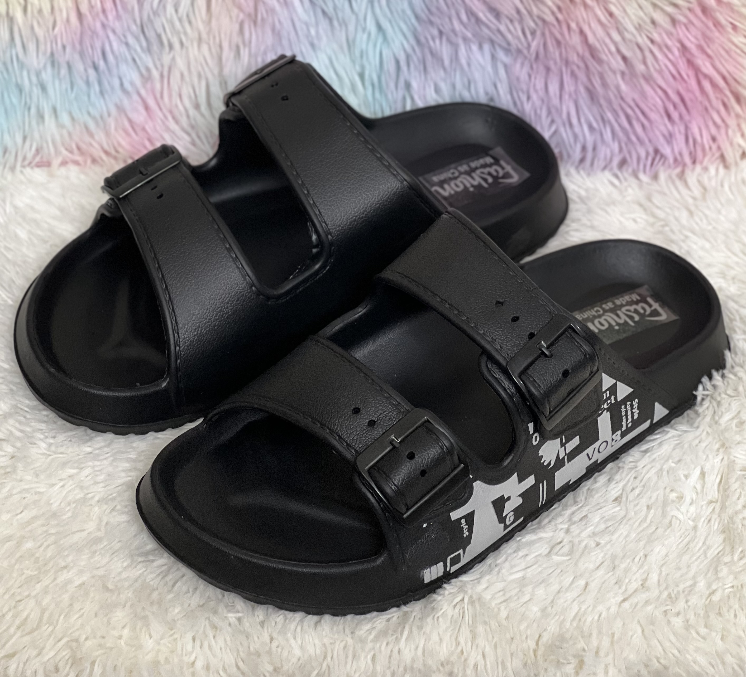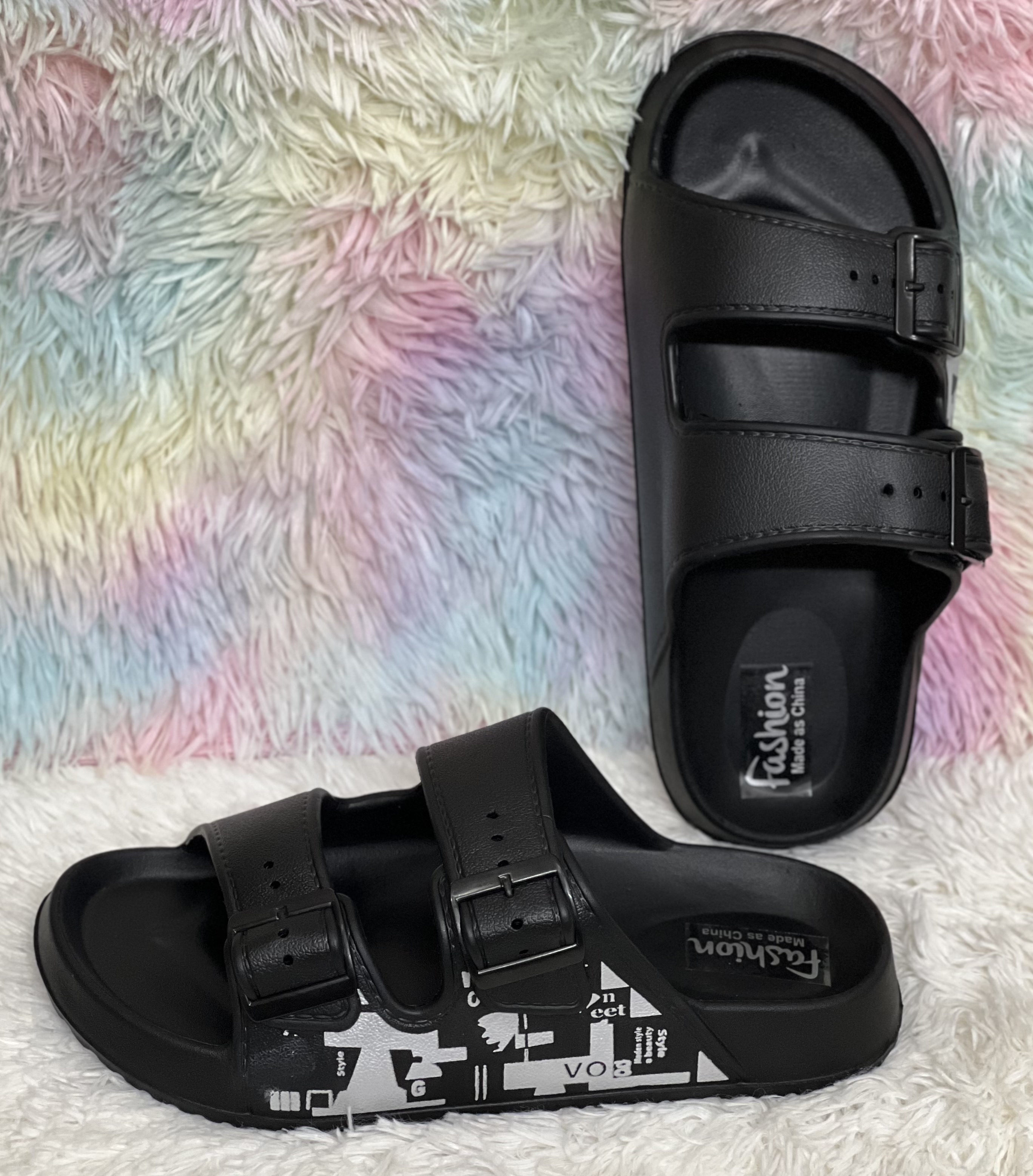 The double adjustable buckle straps ensure a secure, customized fit, while the ergonomic cushioned footbed provides superior comfort throughout the day. Finished with a bold street-inspired printed sole, these slides combine fashion and function effortlessly. Ideal for casual outings, home wear, travel, or daily use.