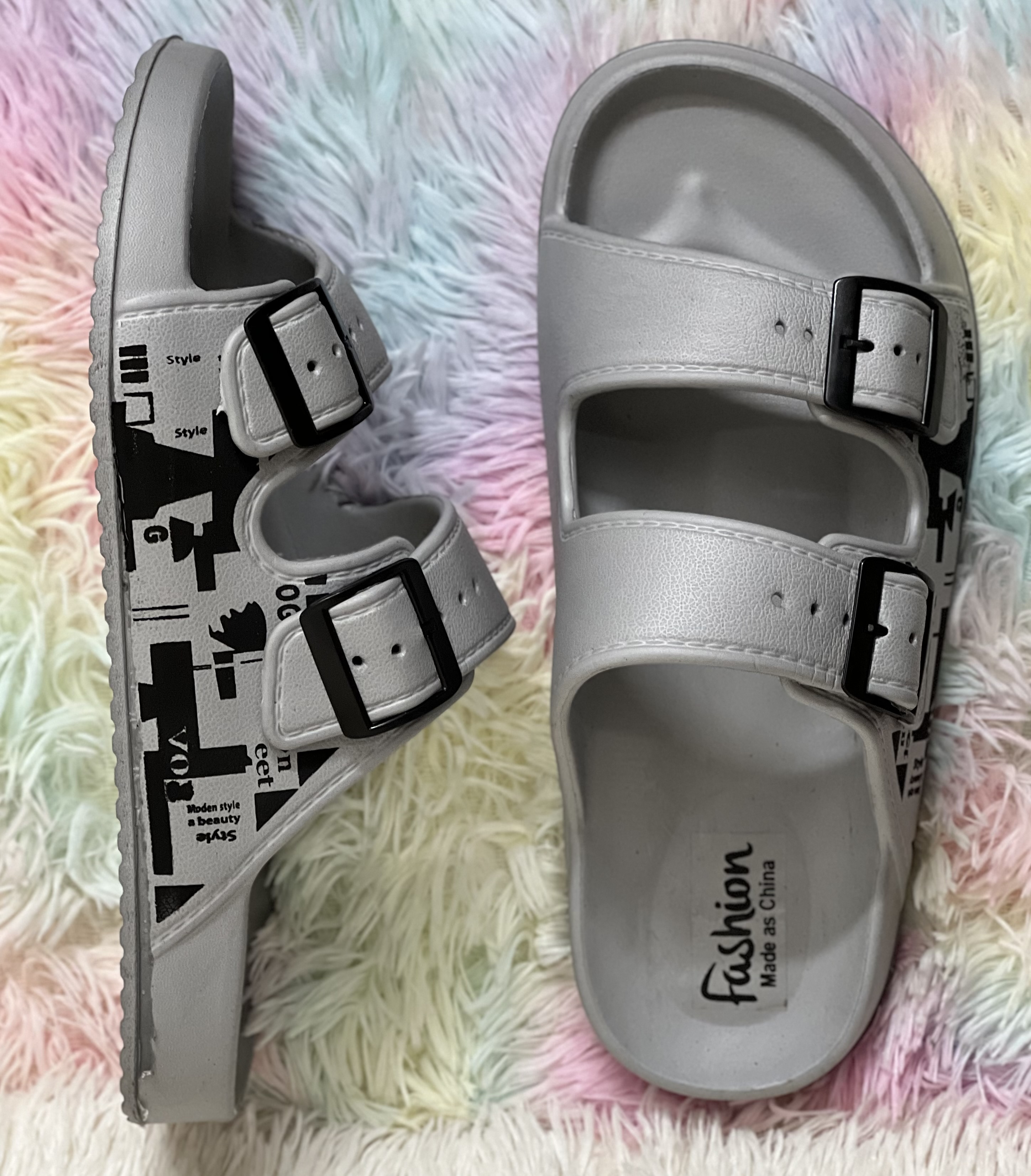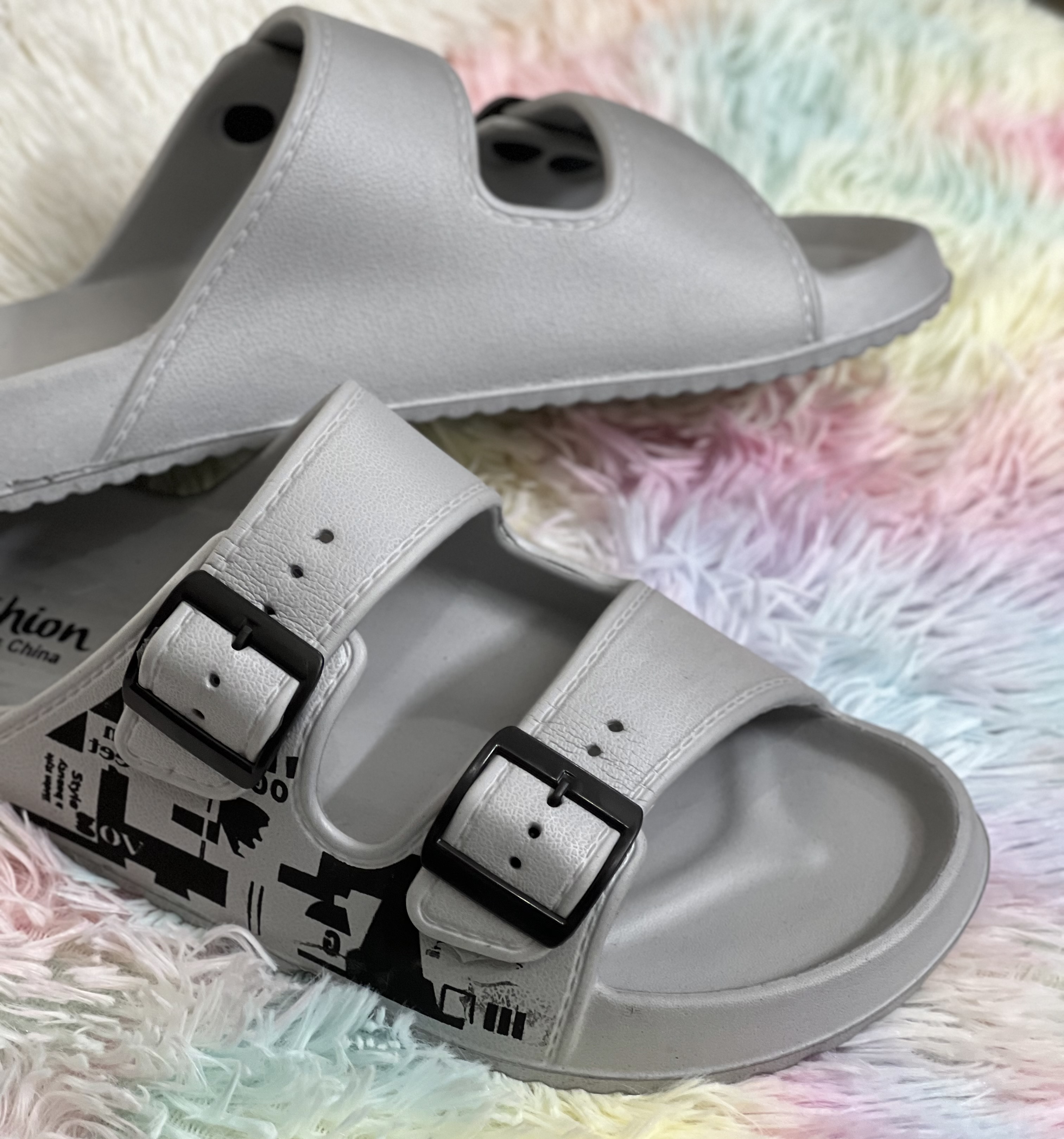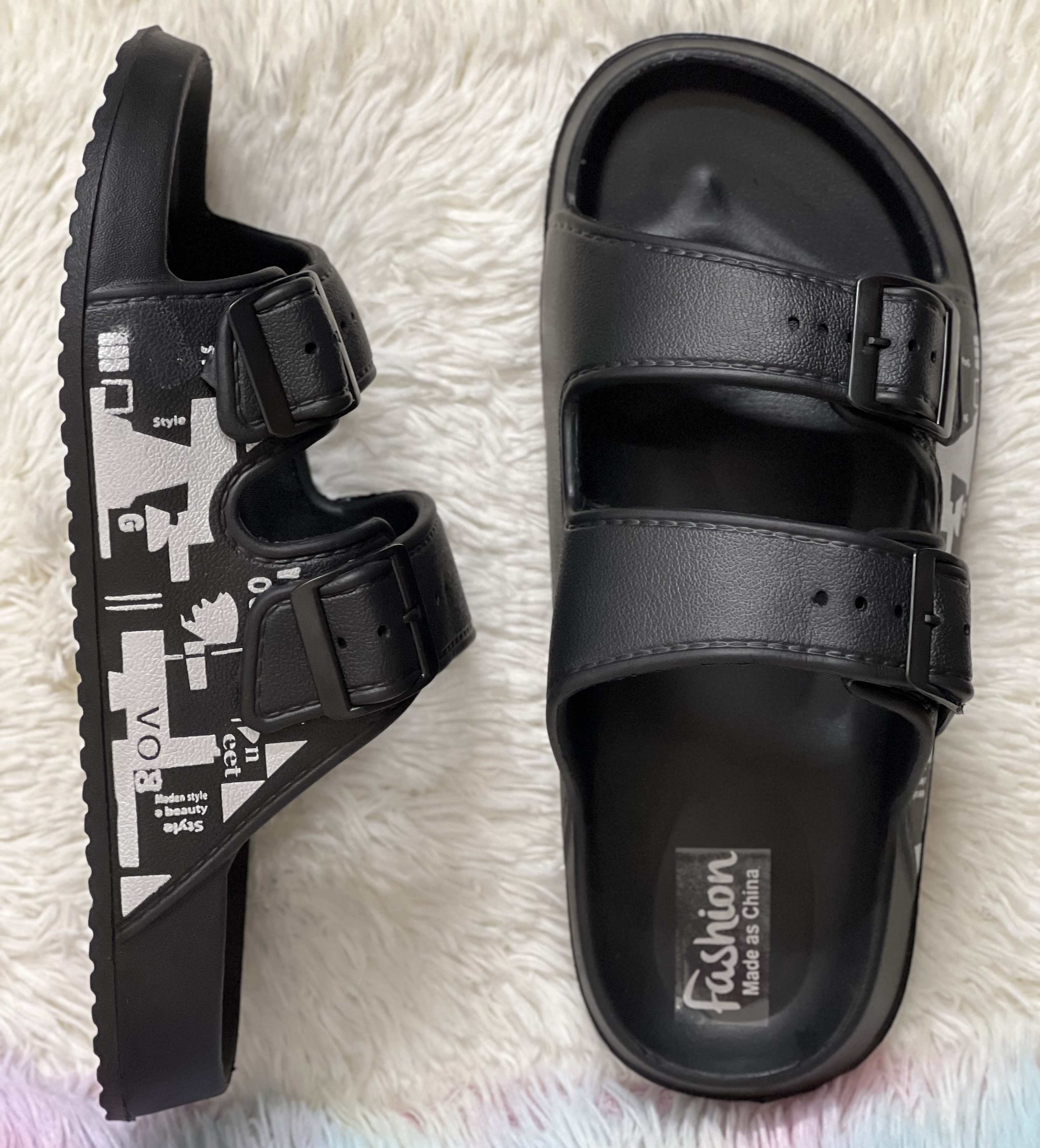The double adjustable buckle straps ensure a secure, customized fit, while the ergonomic cushioned footbed provides superior comfort throughout the day. Finished with a bold street-inspired printed sole, these slides combine fashion and function effortlessly. Ideal for casual outings, home wear, travel, or daily use.