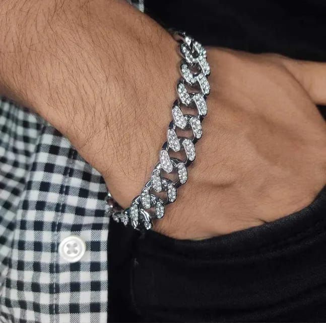 Introducing the new style Men Cuban Link Chain Bracelet, a stunning piece of jewelry designed for the modern man. This bracelet features a shiny rhinestone inlaid bangle, adding a touch of elegance to any outfit. Crafted with platinum, it exudes a luxurious appeal while being durable for everyday wear. Perfect for fashion-forward men, this bracelet is a versatile accessory that can be worn for both casual and formal occasions. Elevate your style with this eye-catching Cuban Link Chain Bracelet that effortlessly combines sophistication and trendiness.
