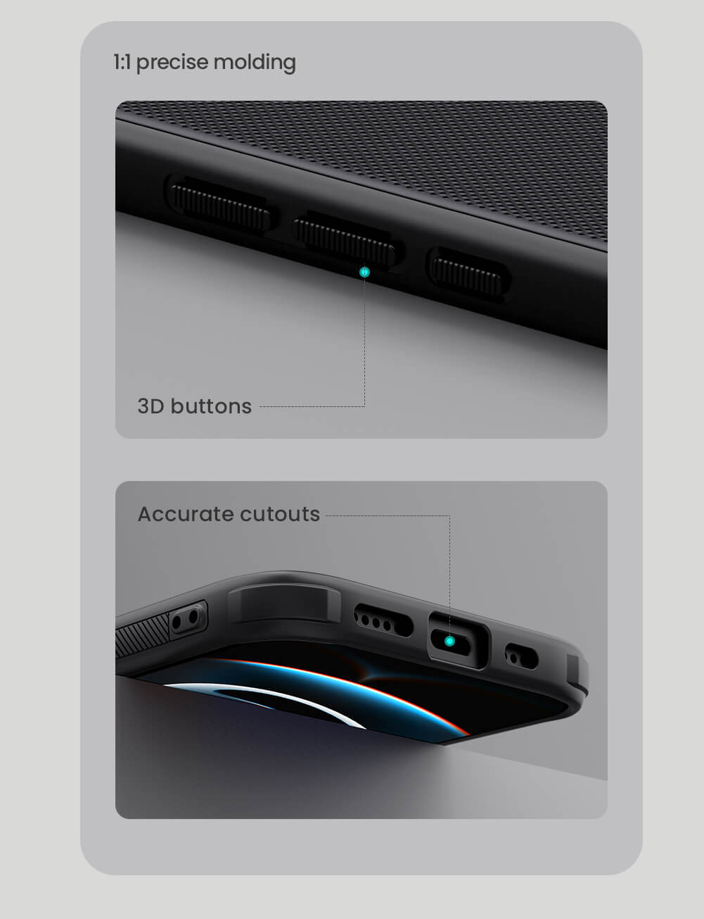 Super Frosted Shield Pro adopts injection molding technology. Use the dual materials of PC and TPU, which upgrade the protection. Enhance the fall resistance with TPU soft borders and bumpers on four corners. PC rigidity is good enough not to transfer and break off easily. Processed by the latest dustless matte UV painting technology, with comfortable sense of touch and elegant appearance. The surface uses salient point design, wear-resistant, anti-skidding, dust-proof, anti-fingerprint and easy to clean. Open mold according to real mobile phone with precise function holes.