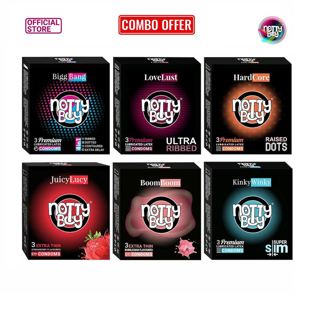 NottyBoy Condom Mini Combo Pack 3x6 = 18Pcs - BigBang 4in1 3s + Ultra Ribbed 3s + Raised Dots 3s + Strawberry 3s + Bubblegum 3s + Super Slim 3s Condom