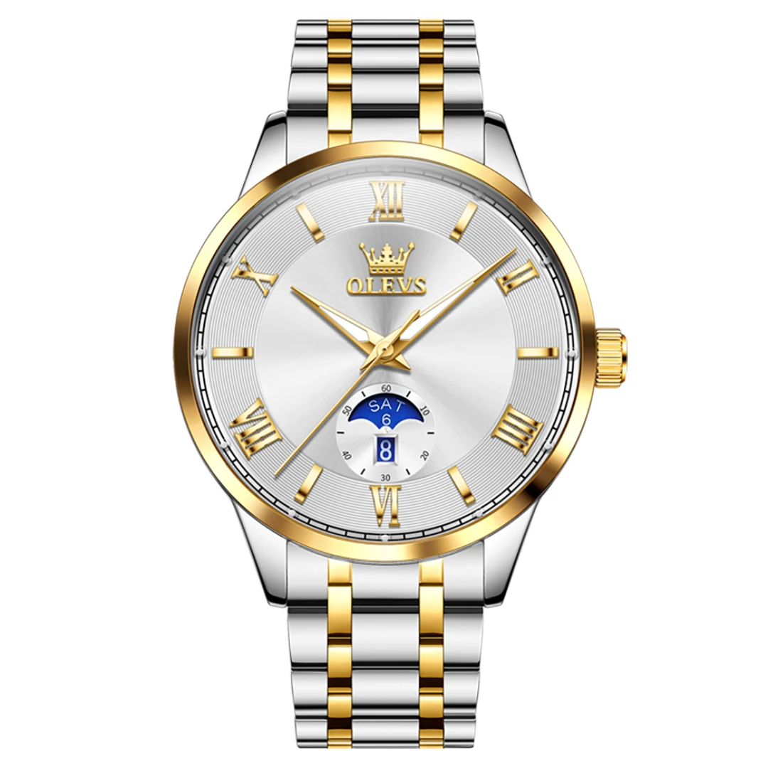 OLEVS 3638 Mens Quartz Moonphase Watch-Golden Silver and Blue
