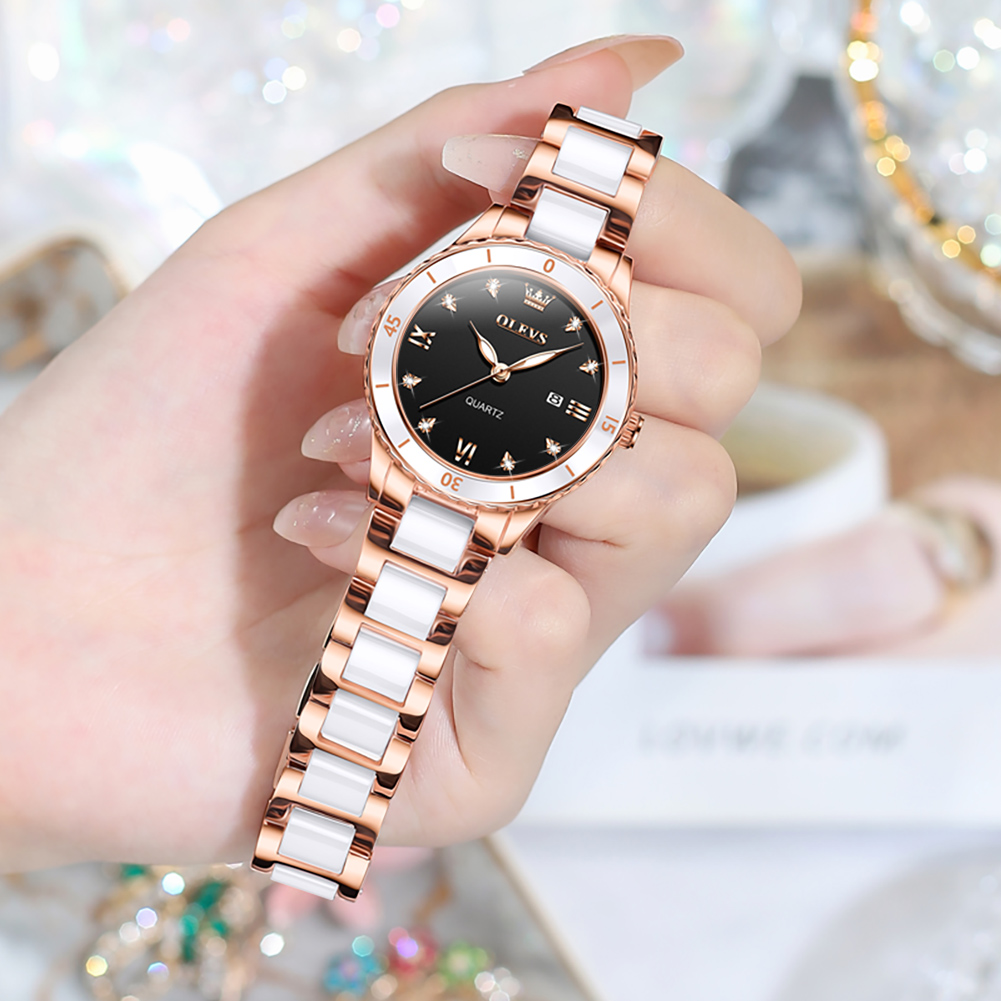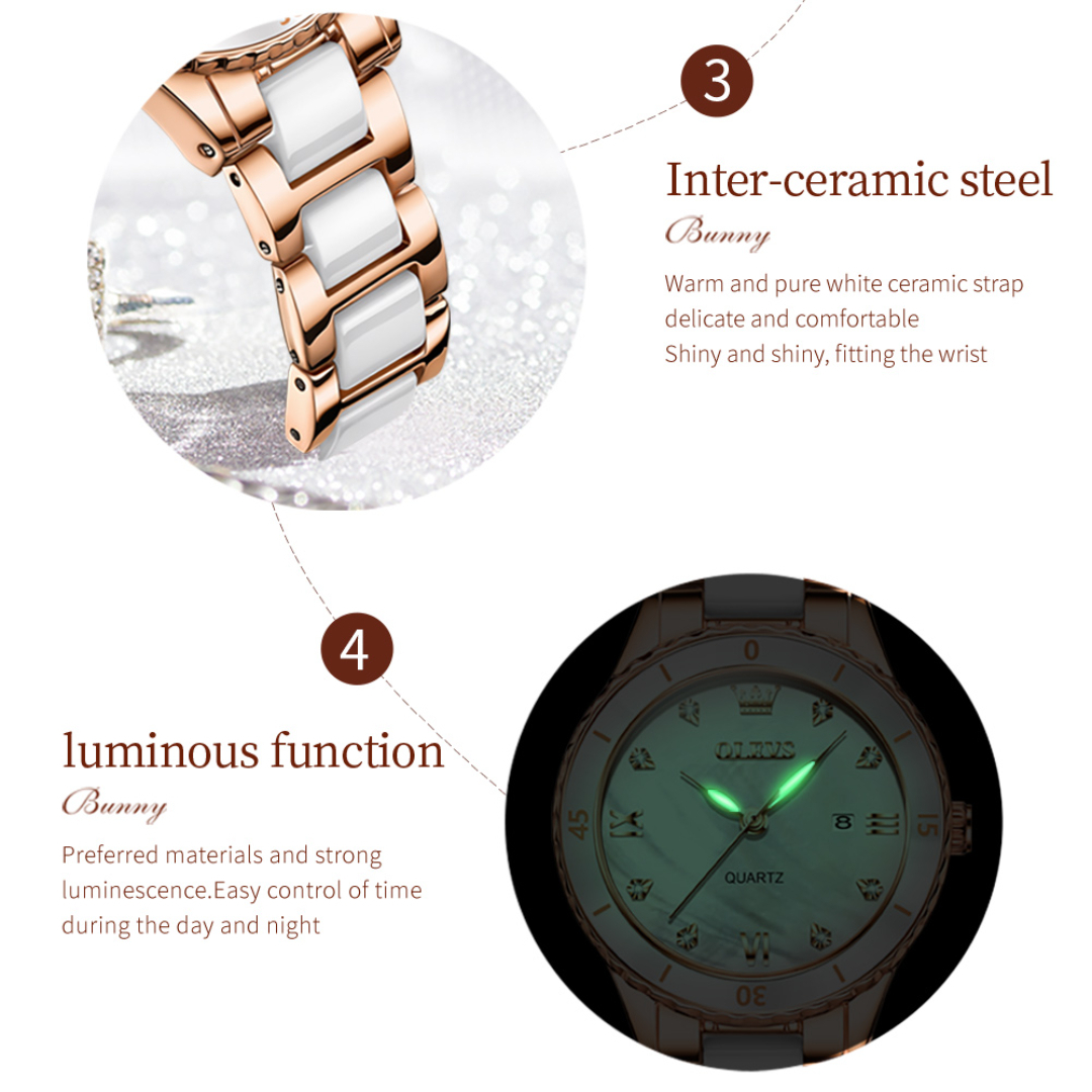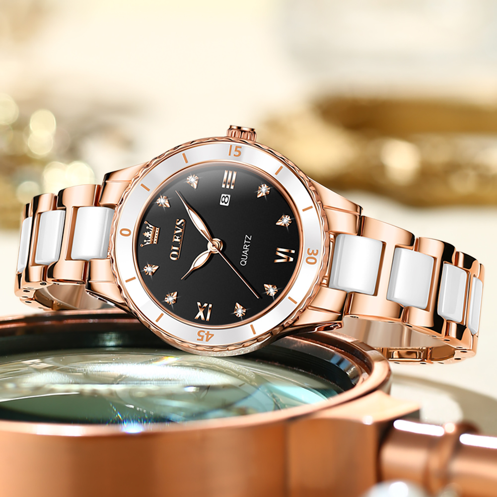 Olevs 9985 RoseGold & White Ceramic Analog Wrist Watch For Women