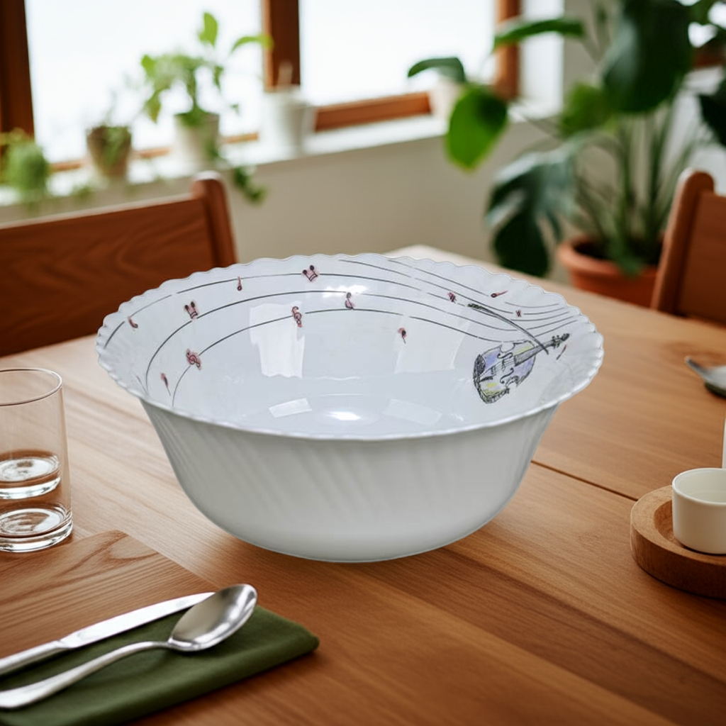 Enhance your dining table with the Opal Glass 9″ Serving Deep Bowl by Chinbull, crafted with premium Pyrex material for everyday durability and elegance. Its printed design adds a stylish touch, making it perfect for daily use or special gatherings.