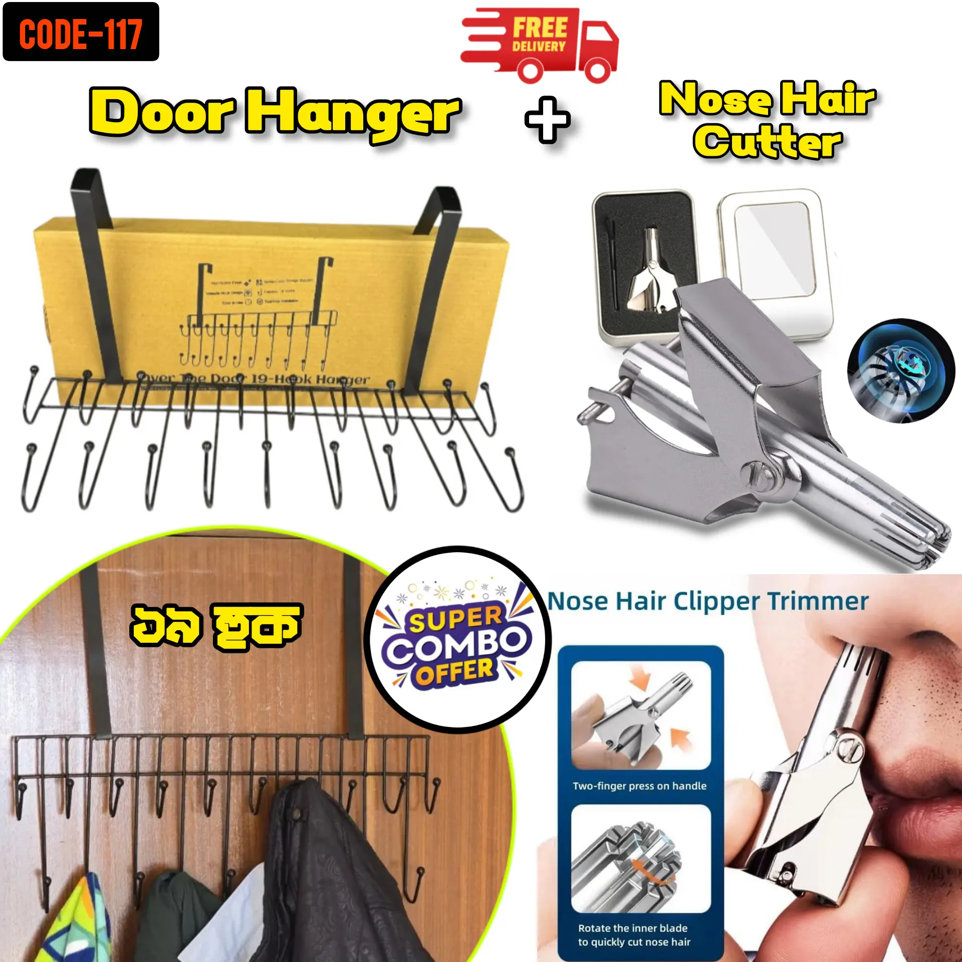 এই কম্বো প্যাকটিতে রয়েছে Over-the-Door 19 Hook Hanger Rack এবং Safe 360° Precision Nose & Ear Hair Trimmer—দুটি অত্যন্ত দরকারি ও ব্যবহারিক প্রোডাক্ট।