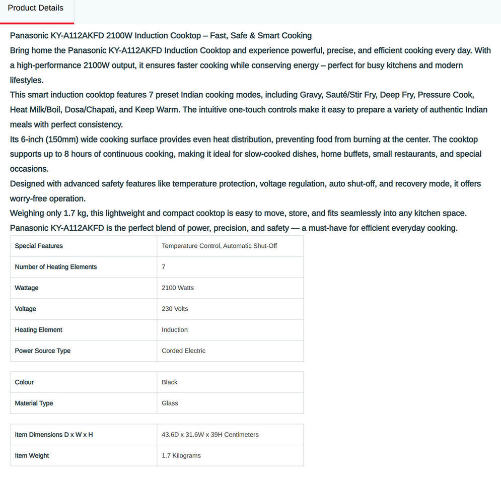 Panasonic KY-A112AKFD Induction Stove Automatic Voltage Regulator and Safety Cut Off