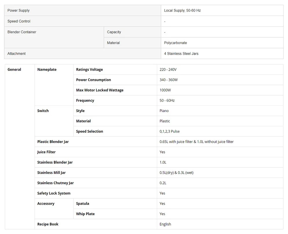 - Jar Types: Juice Extractor Jar, Dry Grinding Jar, Wet Grinding Jar, Chutney Grinding Jar