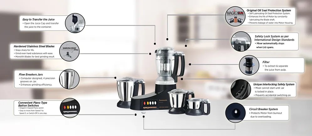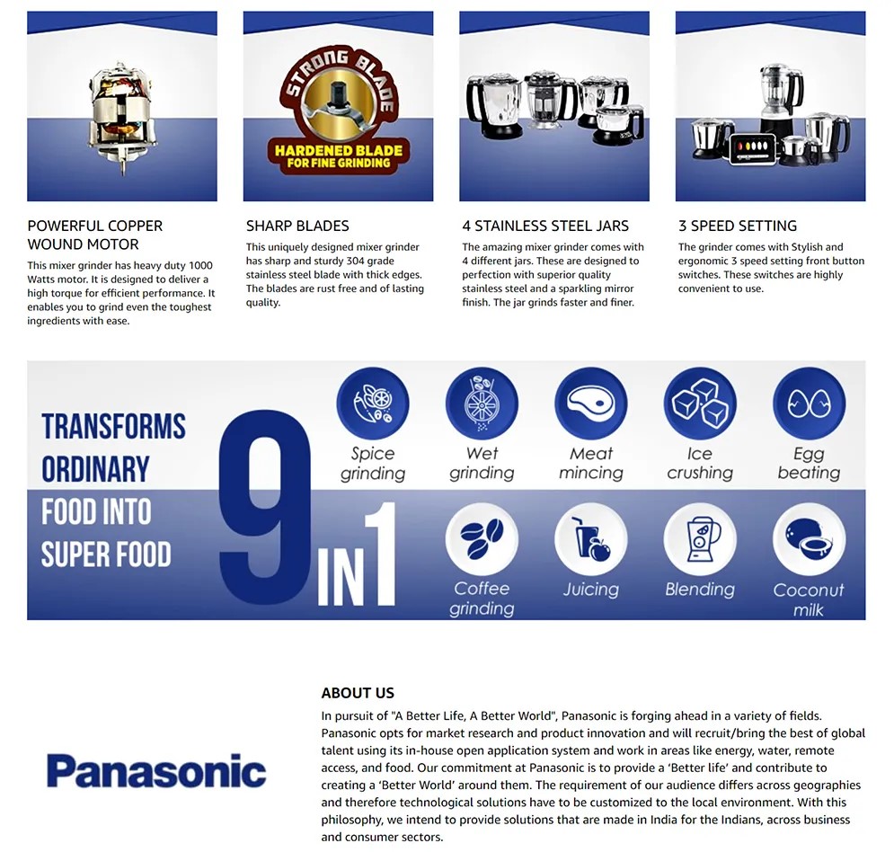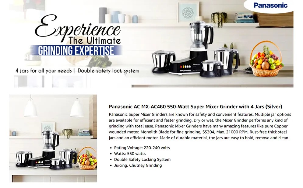 Panasonic 1000W 4-in-1 Mixer Grinder (MX-AC460) Features & Specifications