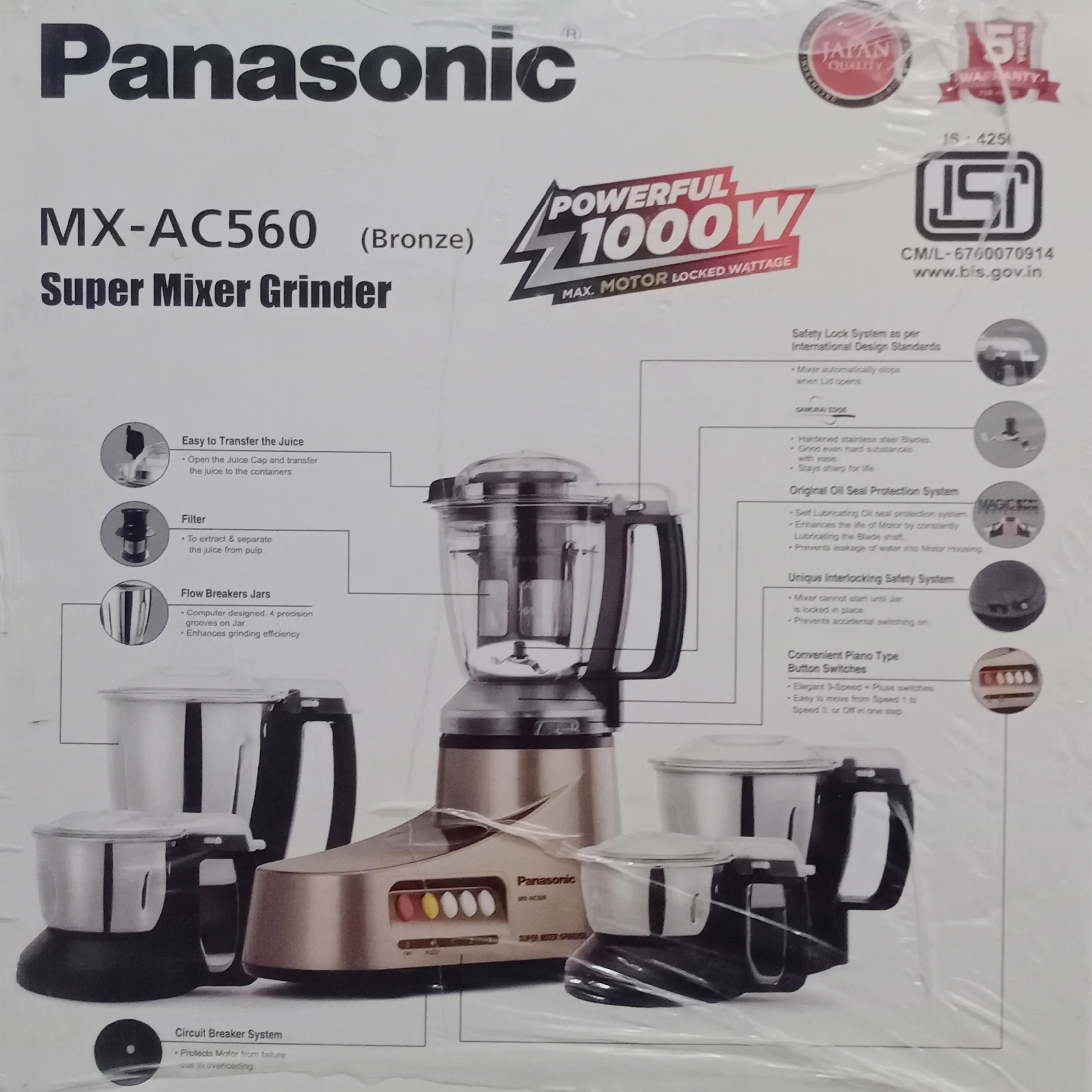 Specifications of Panasonic MX-AC560 9-in-1 Super power 1000w Mixer Grinder