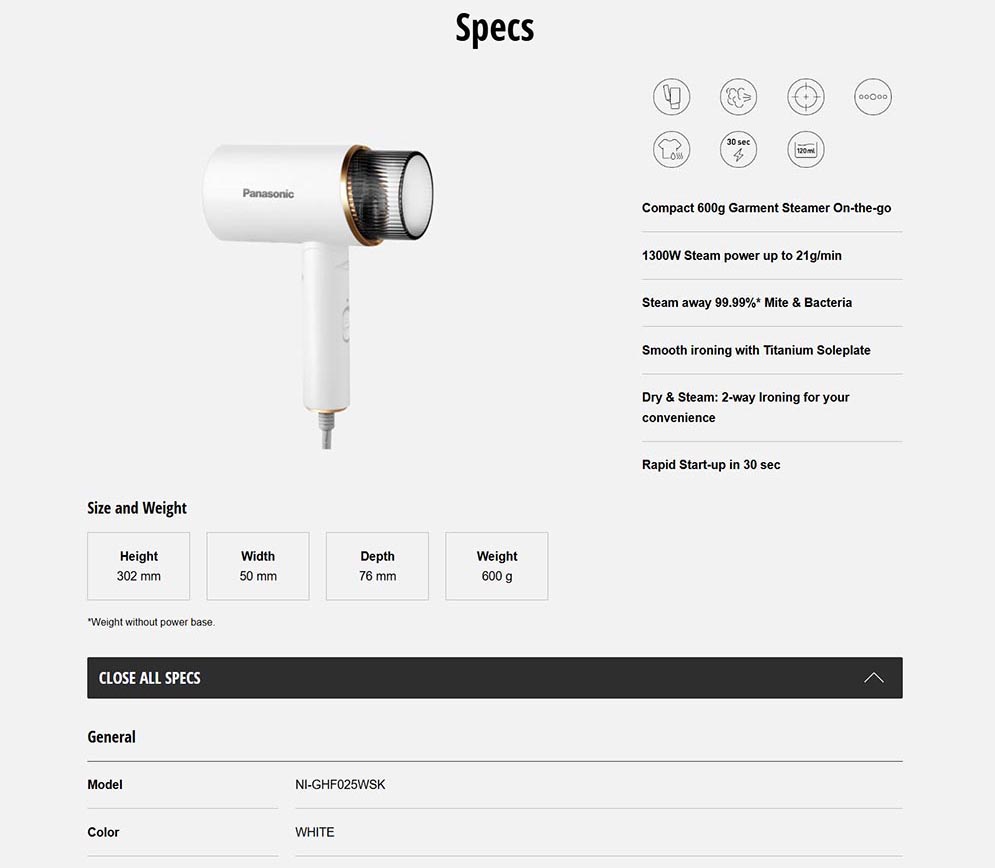 Panasonic NI-GHF025 Foldable Handheld Garment Steamer