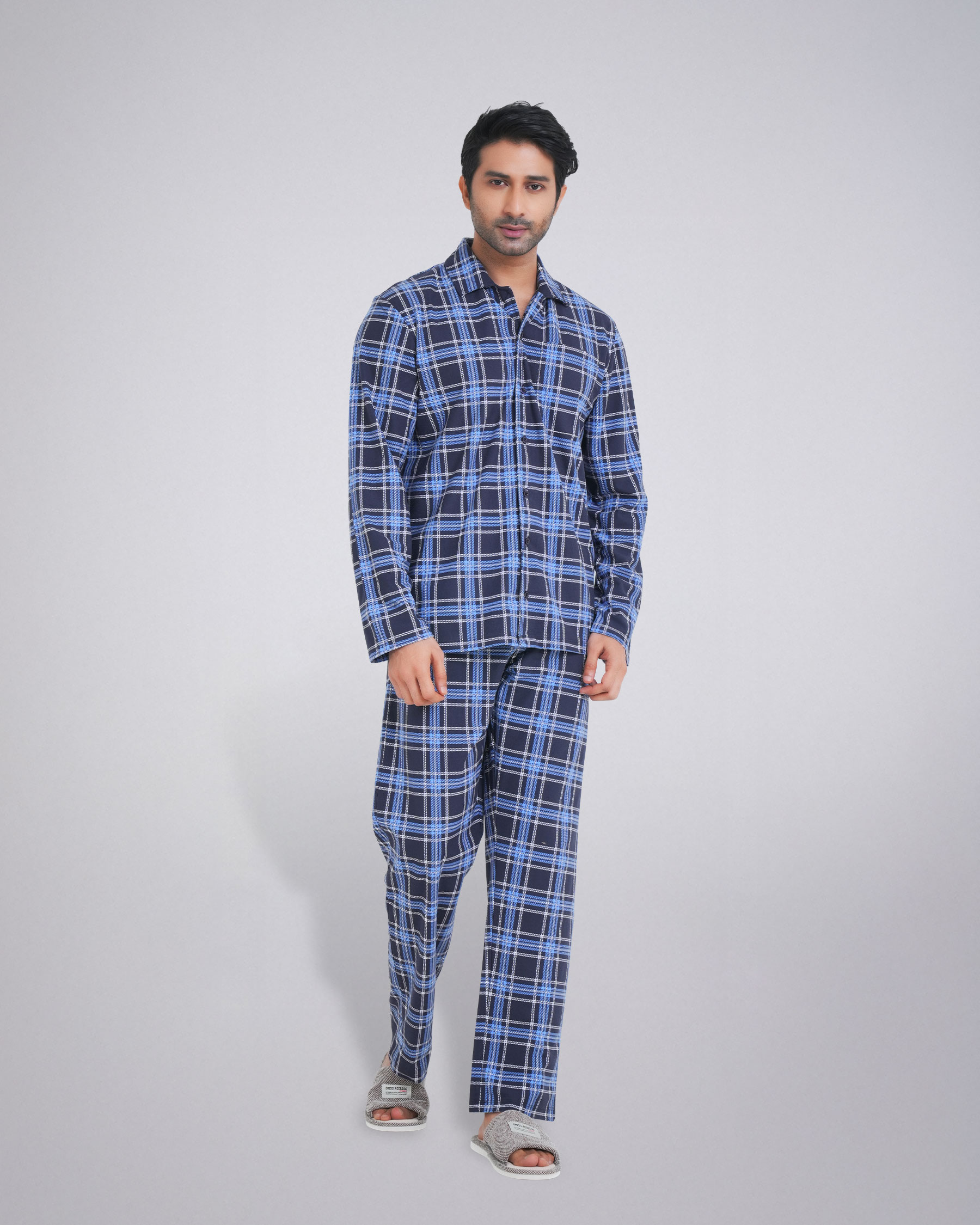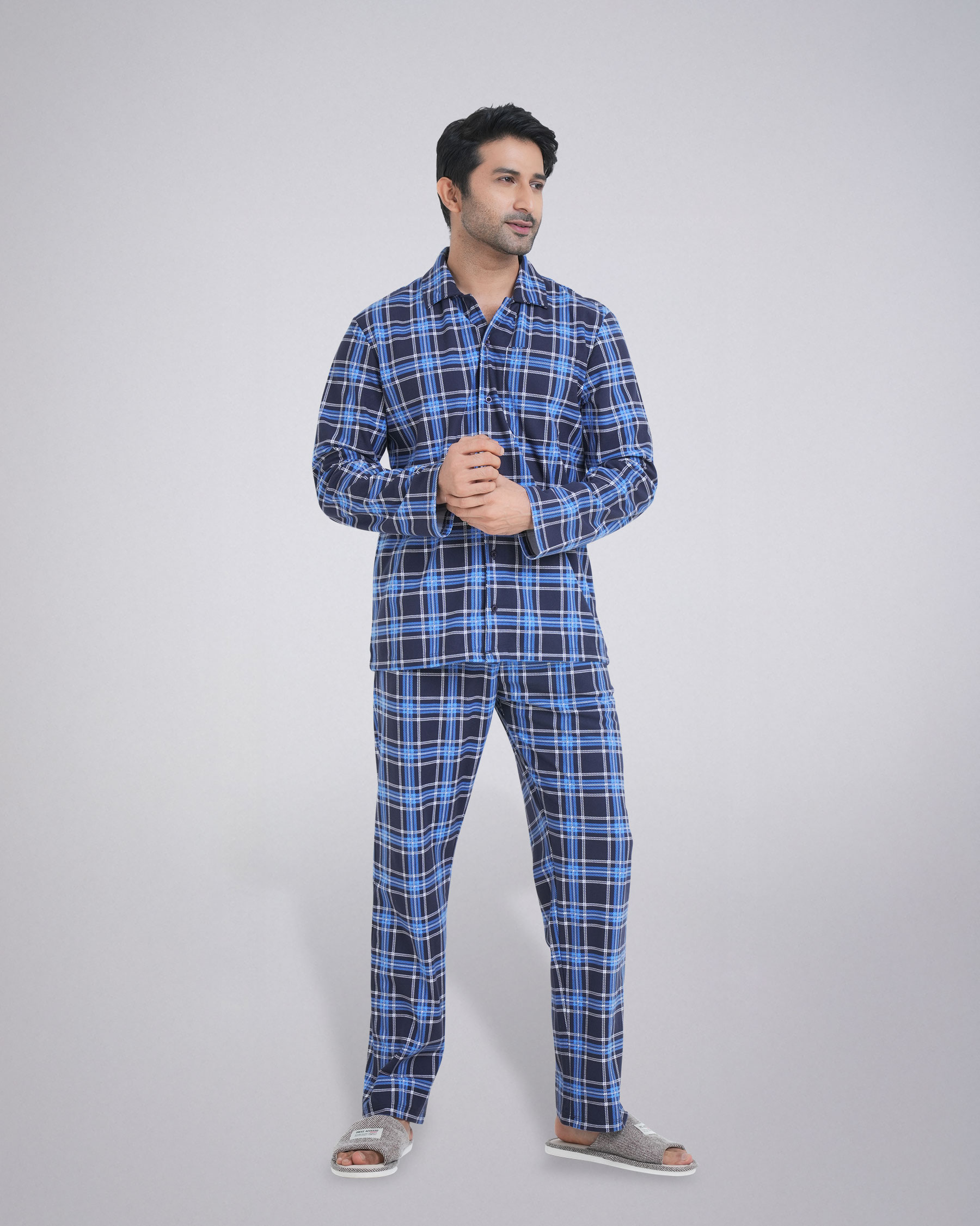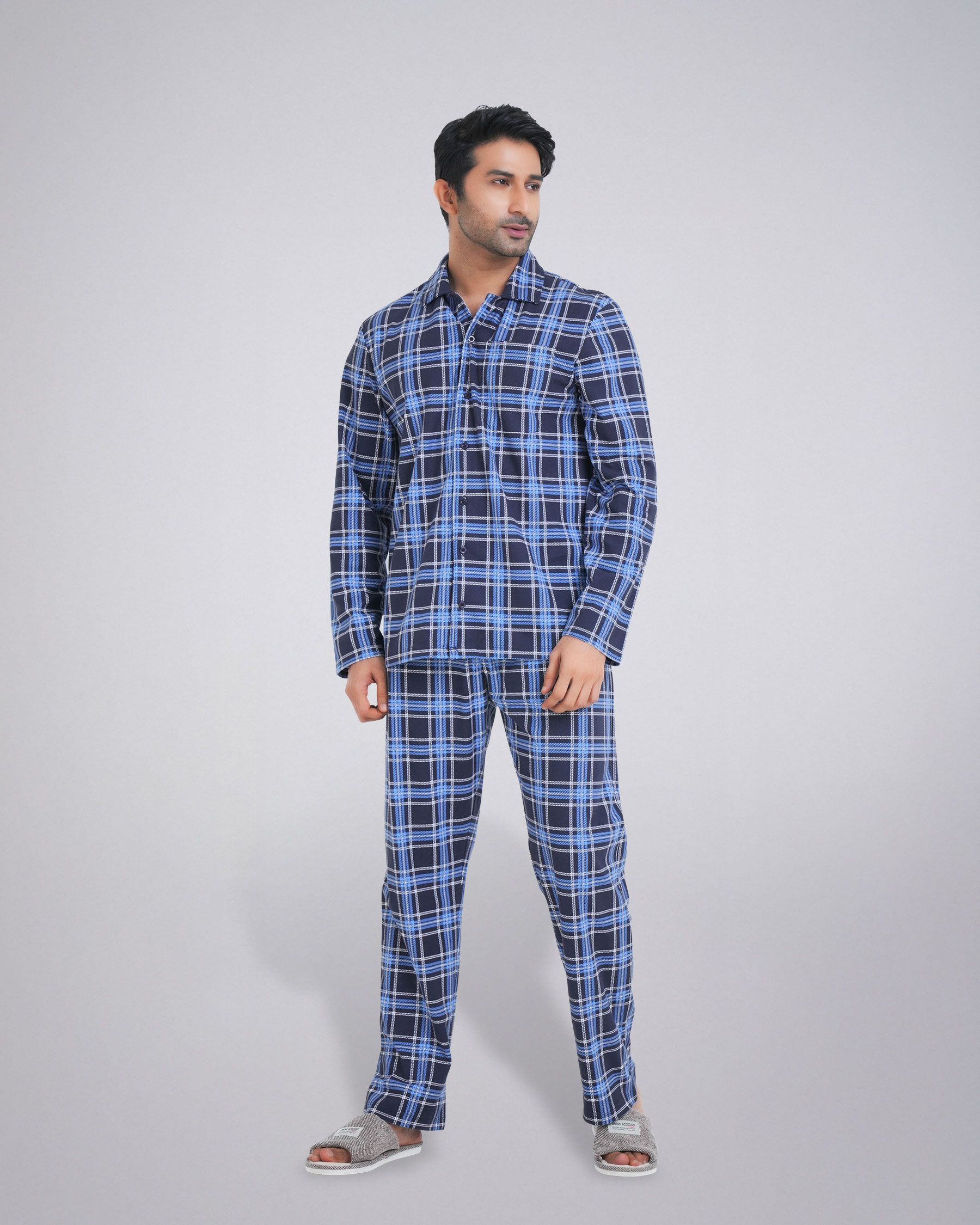 The set features a classic long-sleeve shirt with a stylish collar, complete with a convenient chest pocket. The matching trouser comes with an elastic waistband and an adjustable drawstring, providing a perfect and secure fit. Whether you're unwinding after a long day or enjoying a lazy weekend morning, this pajama set is your go-to choice. Its durable material ensures long-lasting wear, while the easy-care fabric makes it a practical addition to your wardrobe.