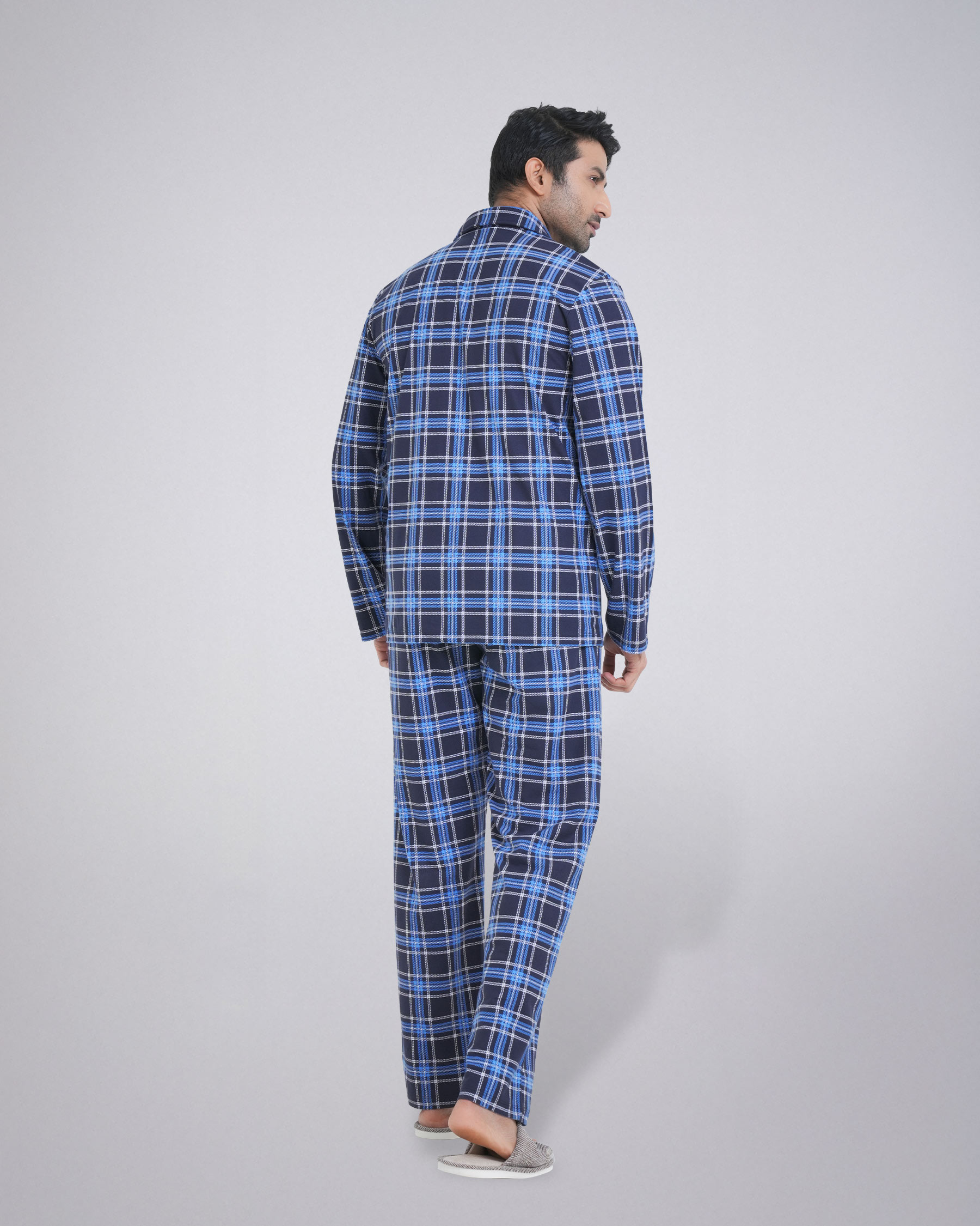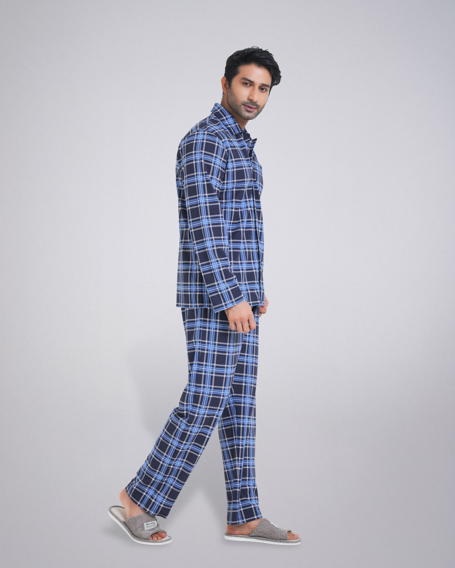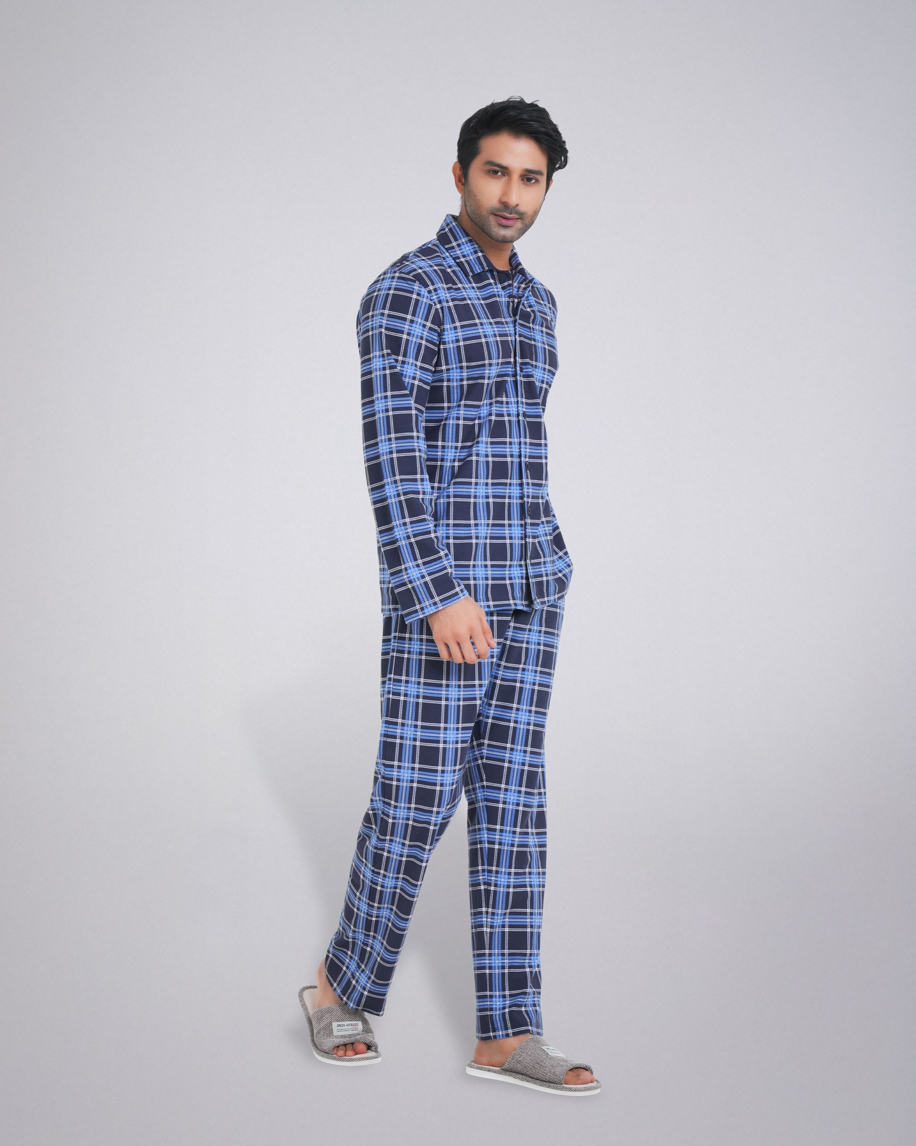 The set features a classic long-sleeve shirt with a stylish collar, complete with a convenient chest pocket. The matching trouser comes with an elastic waistband and an adjustable drawstring, providing a perfect and secure fit. Whether you're unwinding after a long day or enjoying a lazy weekend morning, this pajama set is your go-to choice. Its durable material ensures long-lasting wear, while the easy-care fabric makes it a practical addition to your wardrobe.