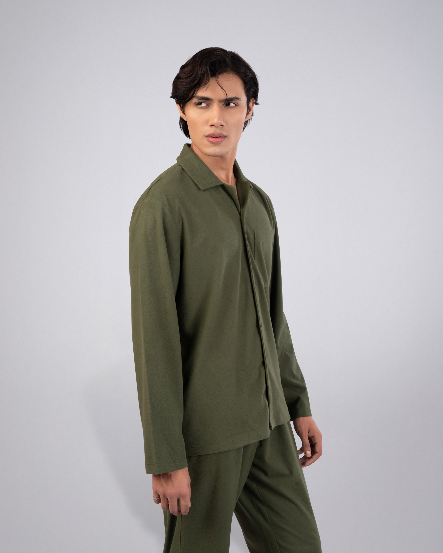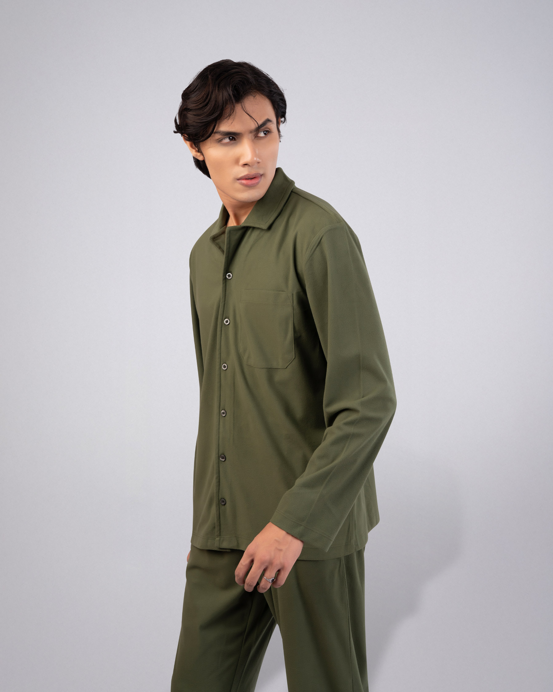The set features a classic long-sleeve shirt with a stylish collar, complete with a convenient chest pocket. The matching trouser comes with an elastic waistband and an adjustable drawstring, providing a perfect and secure fit. Whether you're unwinding after a long day or enjoying a lazy weekend morning, this pajama set is your go-to choice. Its durable material ensures long-lasting wear, while the easy-care fabric makes it a practical addition to your wardrobe.