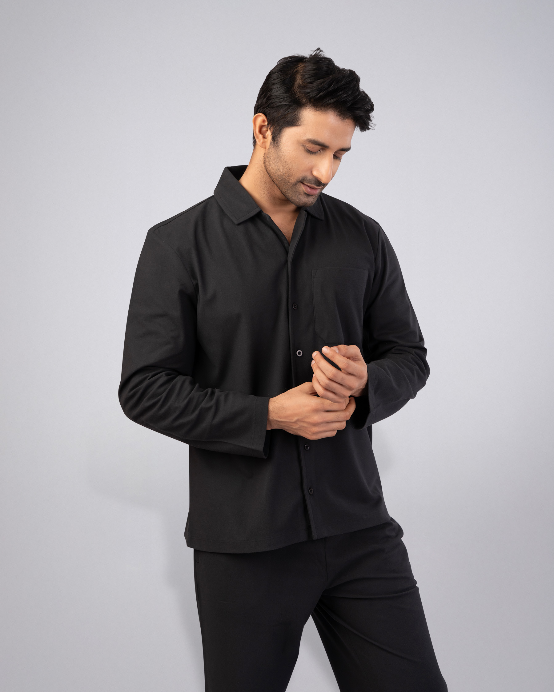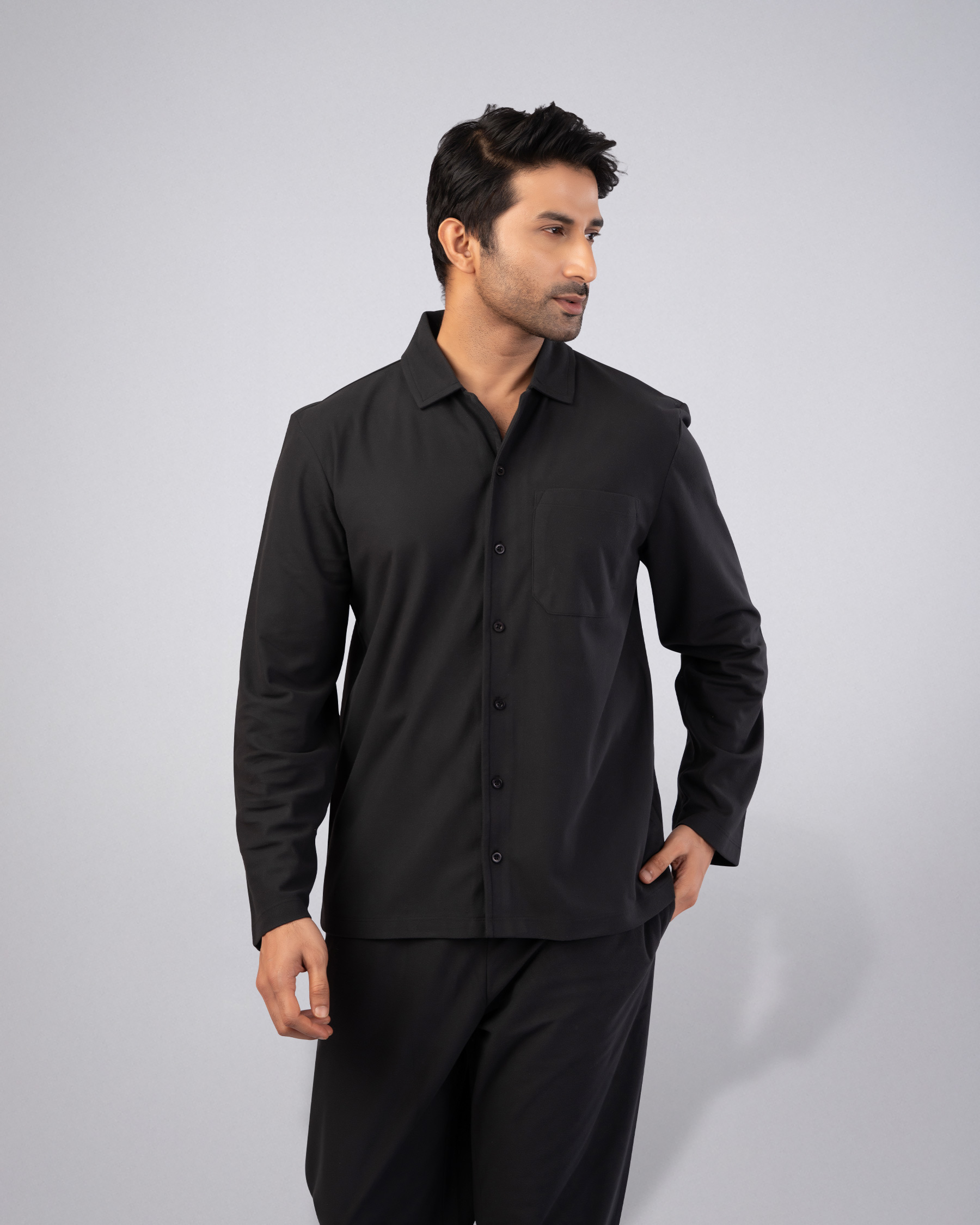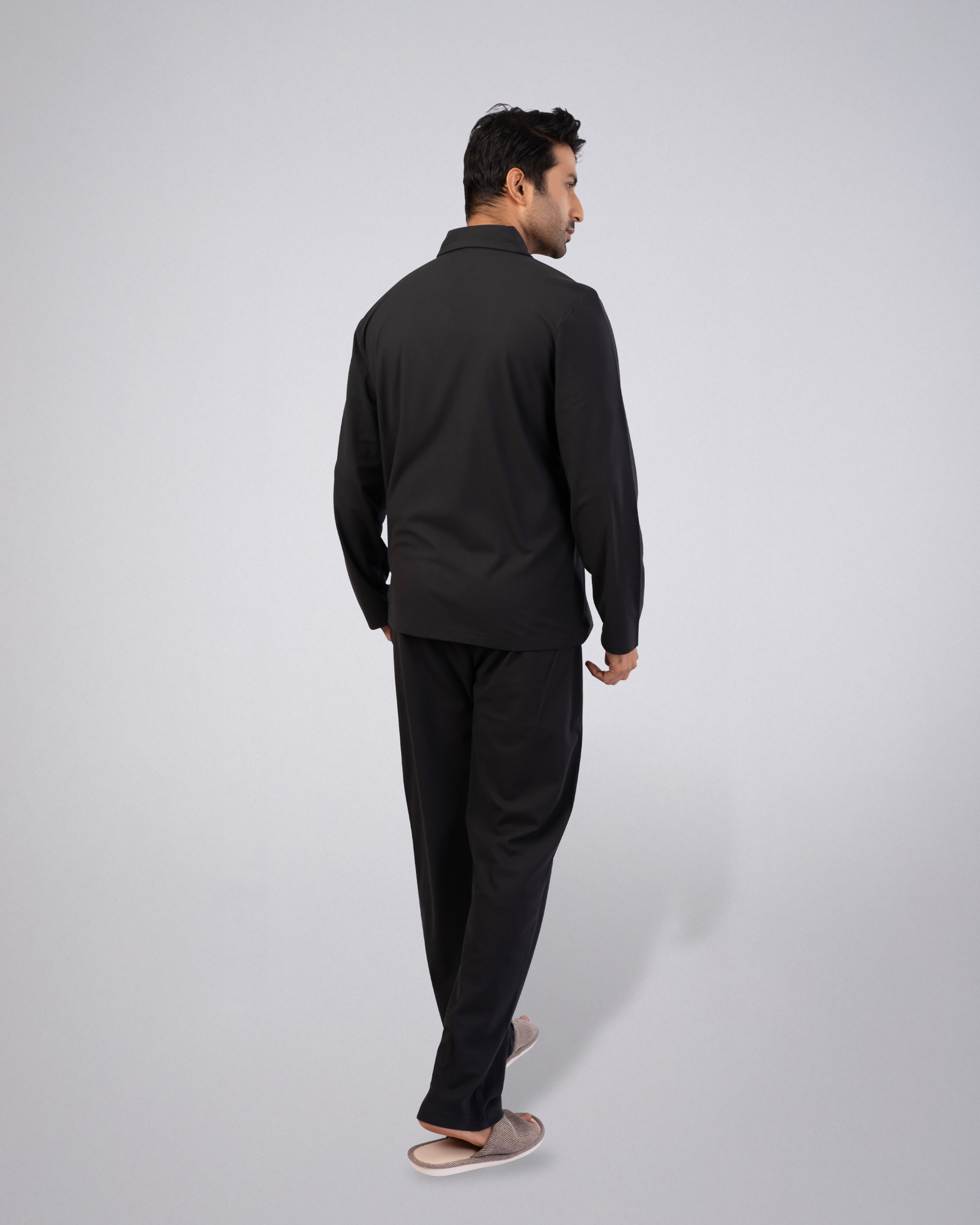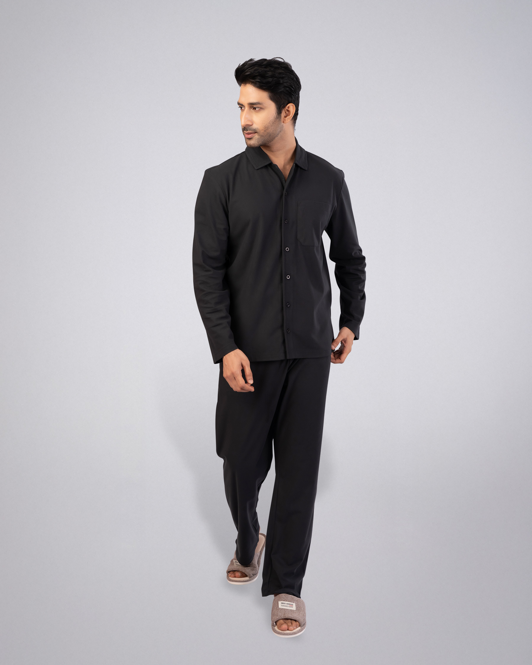 The set features a classic long-sleeve shirt with a stylish collar, complete with a convenient chest pocket. The matching trouser comes with an elastic waistband and an adjustable drawstring, providing a perfect and secure fit. Whether you're unwinding after a long day or enjoying a lazy weekend morning, this pajama set is your go-to choice. Its durable material ensures long-lasting wear, while the easy-care fabric makes it a practical addition to your wardrobe.