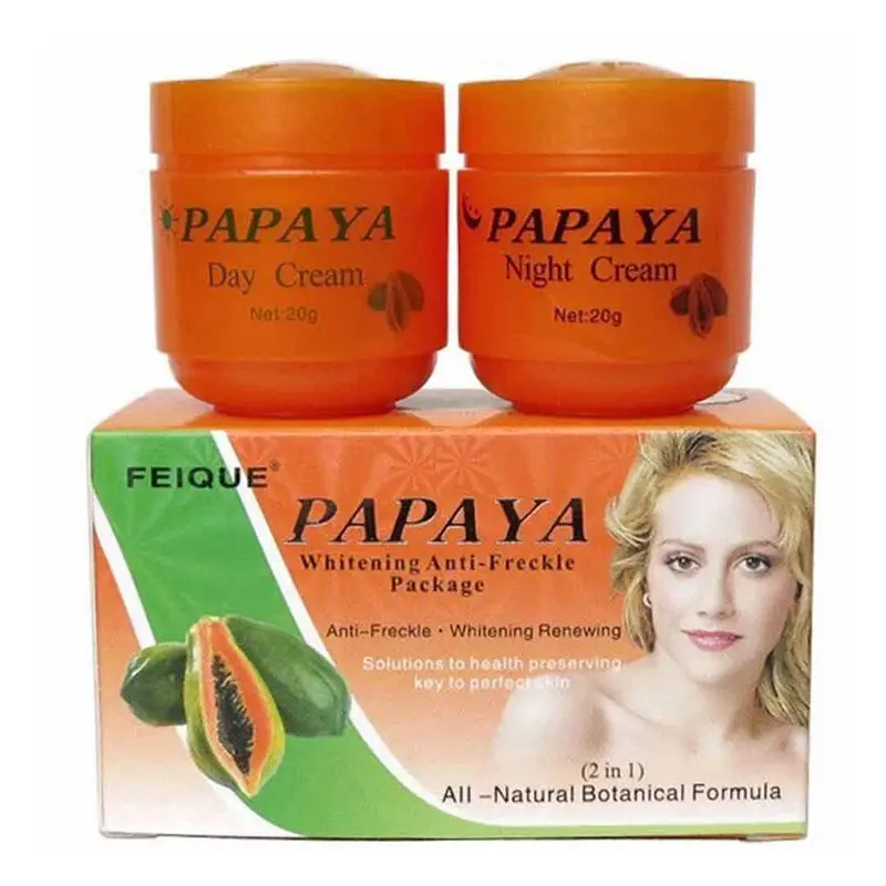 FEIQUE Papaya Whitening Anti-Freckle Day Night Cream Set ️️Brand: FEIQUEMade In P.R.CNet: Day Cream 20g + Night Cream 20gযারা পার্মানেন্টলি ফর্সা হতে চান,নিজের স্কিনটাকে ব্রাইট করতে চান।আমরা তাদের জন্য নিয়ে এসেছি FEIQUE PAPAYA Day & Night Whitening Cream টি।এটি নিয়মিত ব্যবহারের ফলে ২-৩ সপ্তাহেই ভালো রেজাল্ট পাবেন।ডে ক্রিম এর উপকারীতাঃ️মেকাপ লুক দিবে।️সান্সক্রিন এর কাজ করবে।️স্কিন ব্রাইট করবে।️স্কিন এ পিংকিশ গ্লো দিবে।️No Side Effect️ছেলে-মেয়ে উভয়ই ব্যবহার করতে পাড়বে।নাইট এর উপকারিতাঃ️ত্বক ফর্সা ও উজ্জ্বল করে।️ত্বকের কালচে ভাব দূর করে।️যে কোন দাগ দূর করে।️ত্বক নরম করে।️ত্বকের তৈলাক্ত ভাব দূর করে।চোখের নিচের কালো ভাব দূর করে।️মেসতার দাগ দূর করে ।️ত্বক মসৃণ করে।এটি সাধারণত ২-৩ শেড পর্যন্ত ফর্সা করে।️যেকোনো ধরনের ত্বক এ ব্যাবহার করতে পাড়বে।️ছেলে-মেয়ে উভয়ই ব্যবহার করতে পাড়বে।ব্যবহার বিধিঃ১. প্রতিদিন face wash দিয়ে মুখ ভালোভাবে ধুয়ে নিন। তারপর Day ক্রিমটি মুখে এমনভাবে ব্যাবহার করুন যাতে মুখের সাথে মিশে যায়।২.ঠিক একইভাবে রাতেও face wash দিয়ে মুখ ধুয়ে নিন এবং Night ক্রিমটি ভালোভাবে মুখে ব্যাবহার করুন।