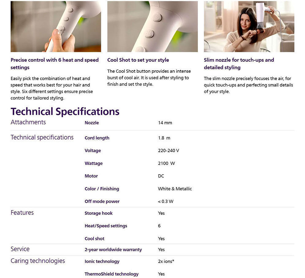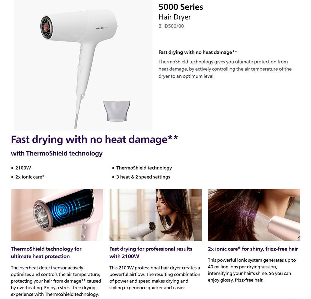 Philips BHD500/00 Essential DryCare Hair Dryer with ThermoShield technology 5000 Series for Women