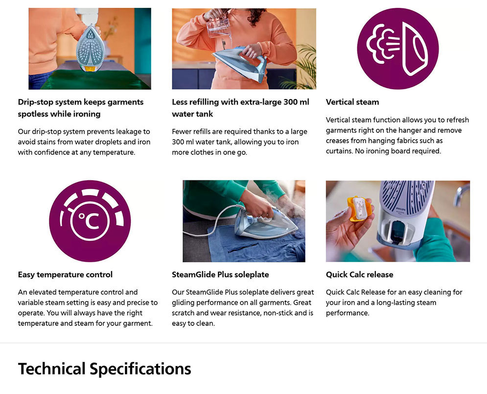Philips DST7011/26 HV Steam Iron 7000 Series SteamGlide Plus Soleplate