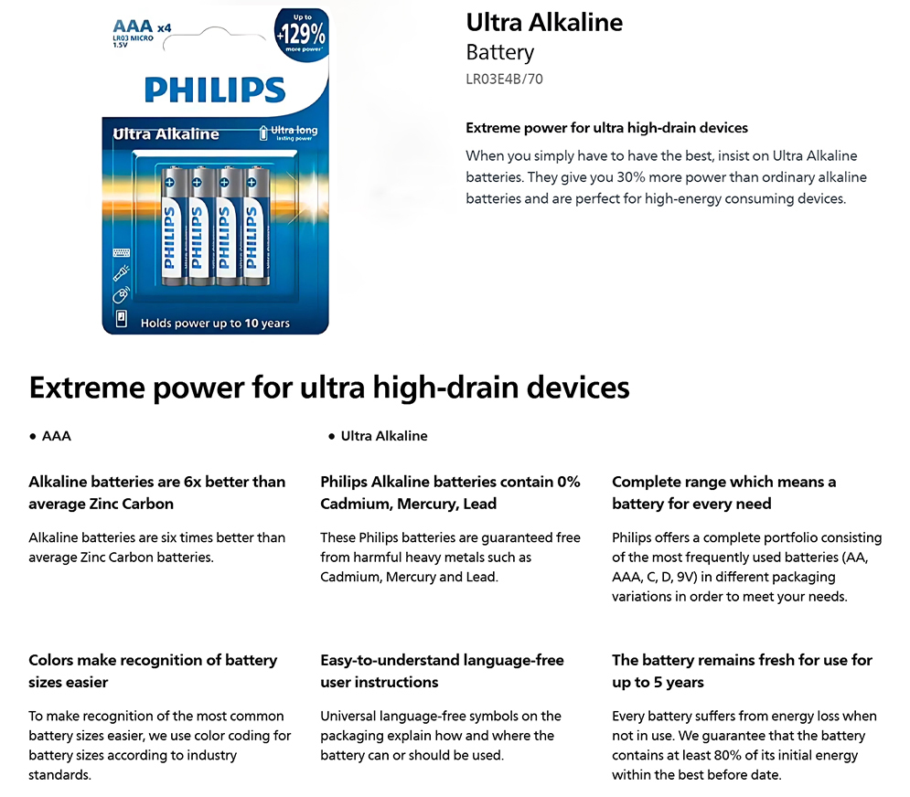 Philips LR03E4B/70 AAA Ultra Alkaline Battery Bundle of 4 Pieces