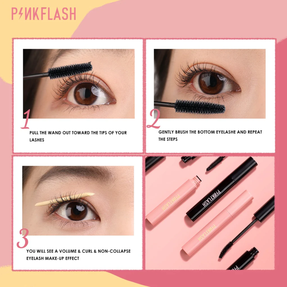PINKFLASH Day & Night Mascara. Day mascara creates a lengthen and micro-curl natural makeup effect. Night mascara creates 4X volume and curls sexy killer eyes. Both are 12h long lasting and easy to clean (it can be removed with warm water).