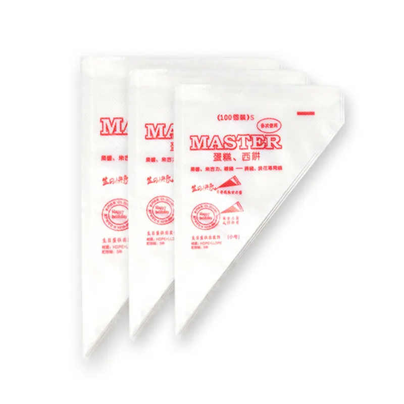 plastic disposable piping bags for cake decorating. Each bag is labeled with the brand "MASTER" and is designed for use in decorating cakes, cookies, and other baked goods with cream or icing. The bags are typically used by pastry chefs, bakers, or hobbyists for precise application of frosting, royal icing, or other decorations. The packaging indicates that each bag is pre-packaged with 100 bags, suggesting it is intended for bulk use. These bags are often used for piping intricate designs on cakes, cupcakes, and cookies. The material appears to be durable, with a smooth surface to allow easy handling and consistent flow of icing.