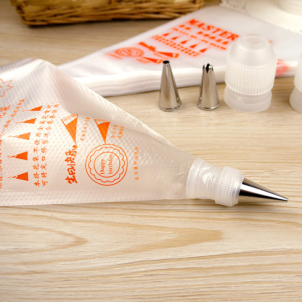 plastic disposable piping bags for cake decorating. Each bag is labeled with the brand "MASTER" and is designed for use in decorating cakes, cookies, and other baked goods with cream or icing. The bags are typically used by pastry chefs, bakers, or hobbyists for precise application of frosting, royal icing, or other decorations. The packaging indicates that each bag is pre-packaged with 100 bags, suggesting it is intended for bulk use. These bags are often used for piping intricate designs on cakes, cupcakes, and cookies. The material appears to be durable, with a smooth surface to allow easy handling and consistent flow of icing.