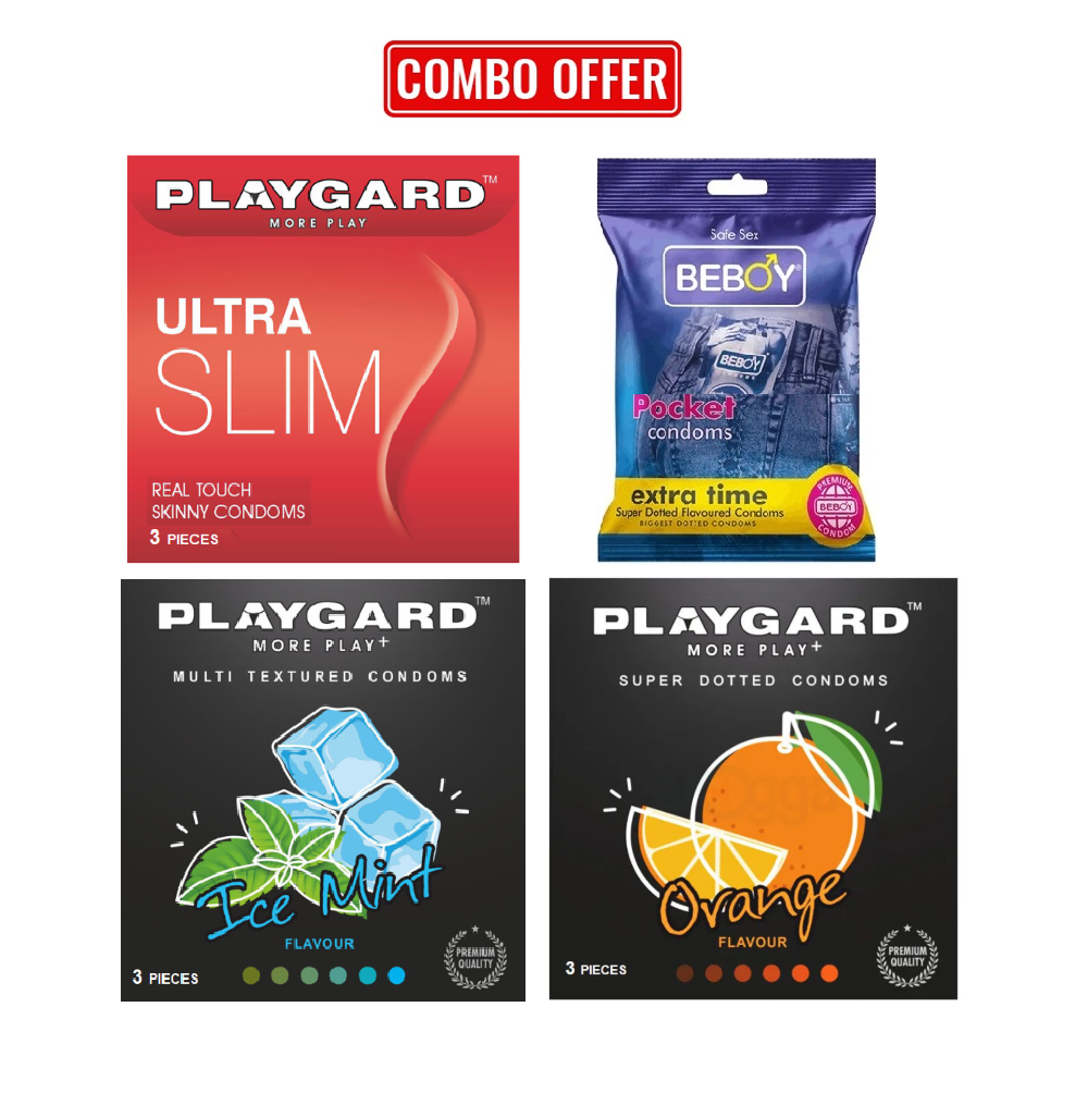 Playgard (Climax Combo Pack) Orange , Ultra Slim , Ice Mint, Beboy Extra Time Flavoured - DOTTED Condom 3x4 = 12Pcs Pack