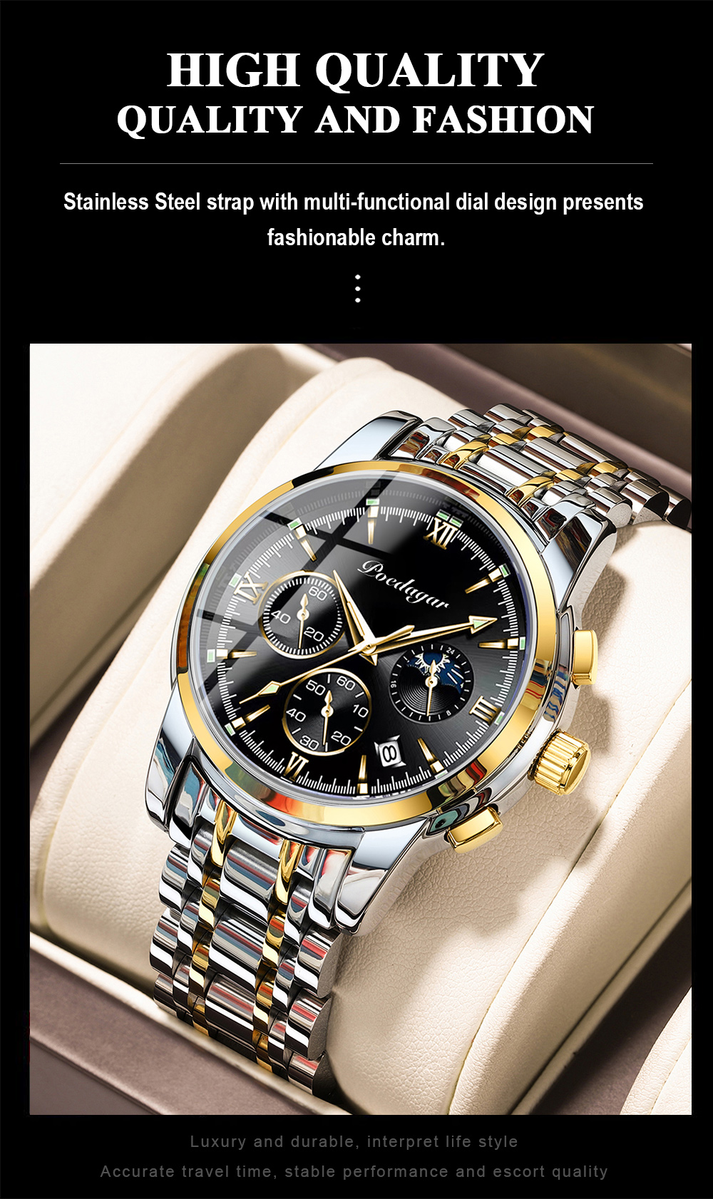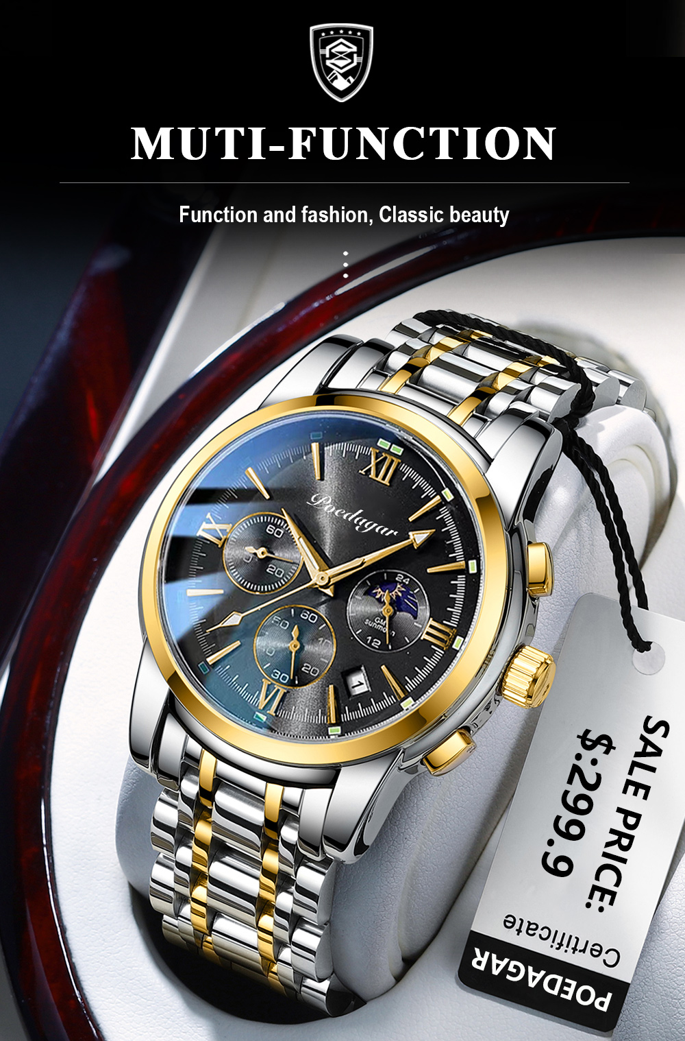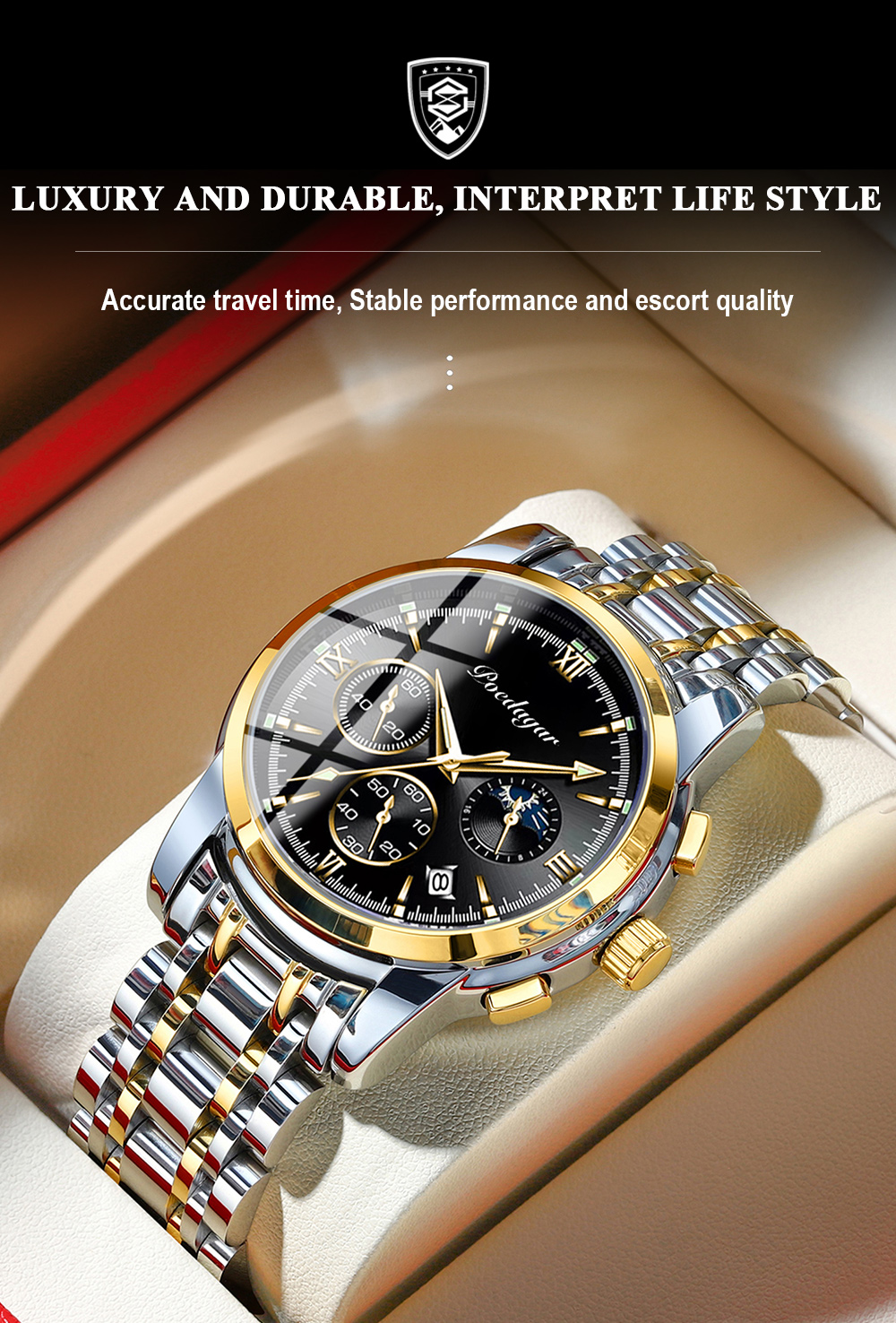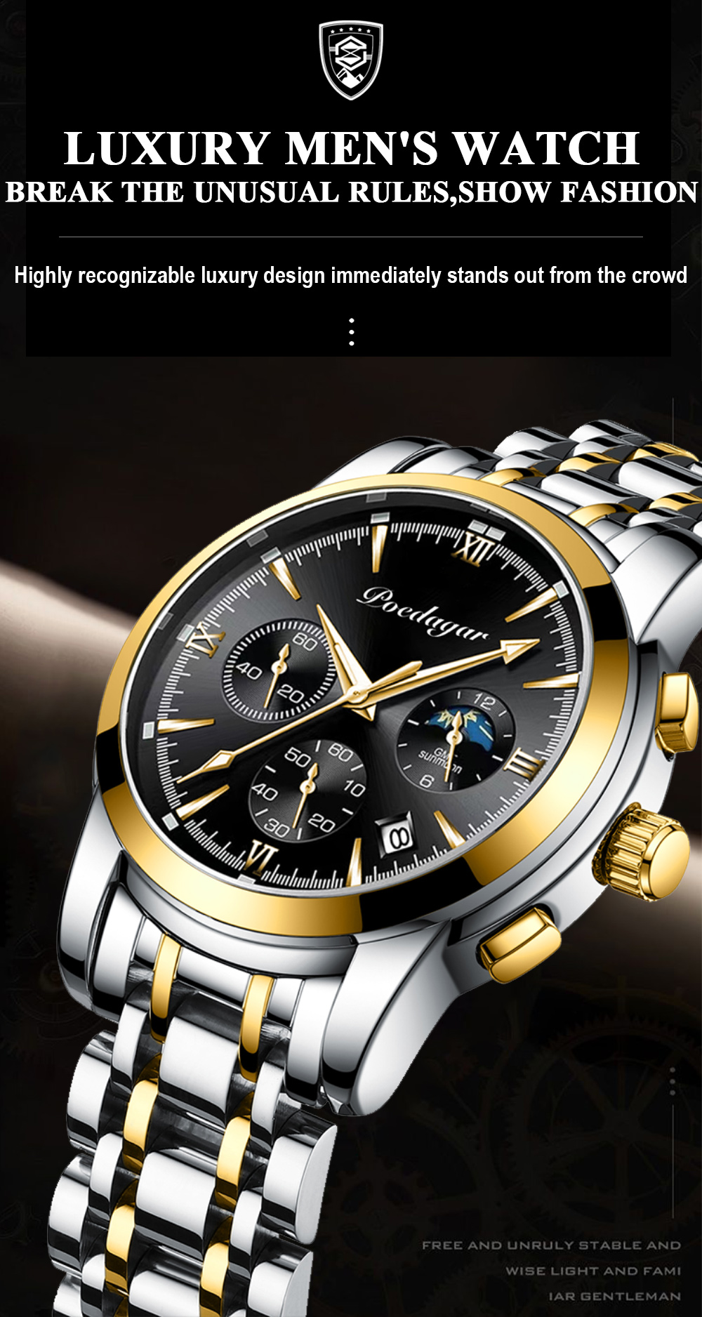 Poedagar PO805S Silver & Golden Two Tone Stainless Steel Chronograph Wrist Watch For Men - Black & Silver & Golden