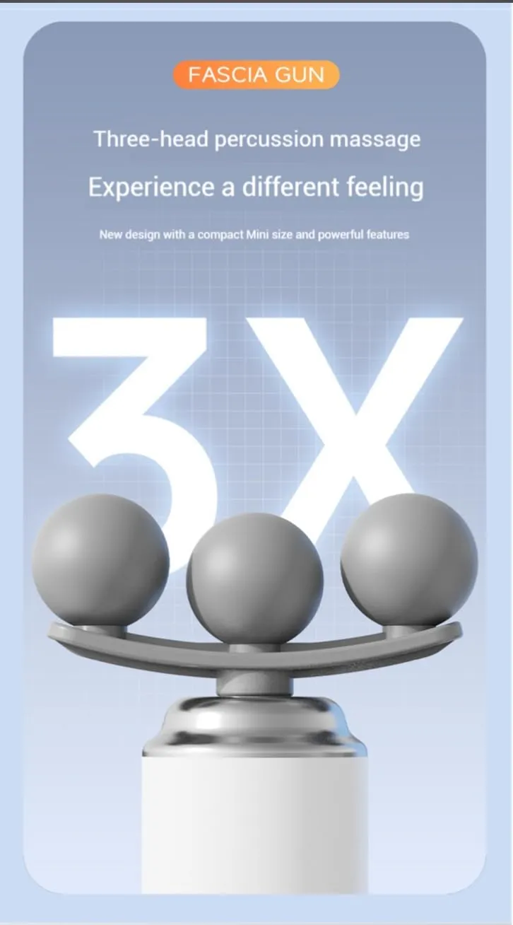 Product details of Portable Massage Gun, Triple head Massage Gun Pro+ Mini, 3-Head Percussion, 6-Speed Settings, Deep Tissue Muscle Relief, 2300-3200RPM, with 9 Attachments, 1200mAh BatteryProduct Specifications