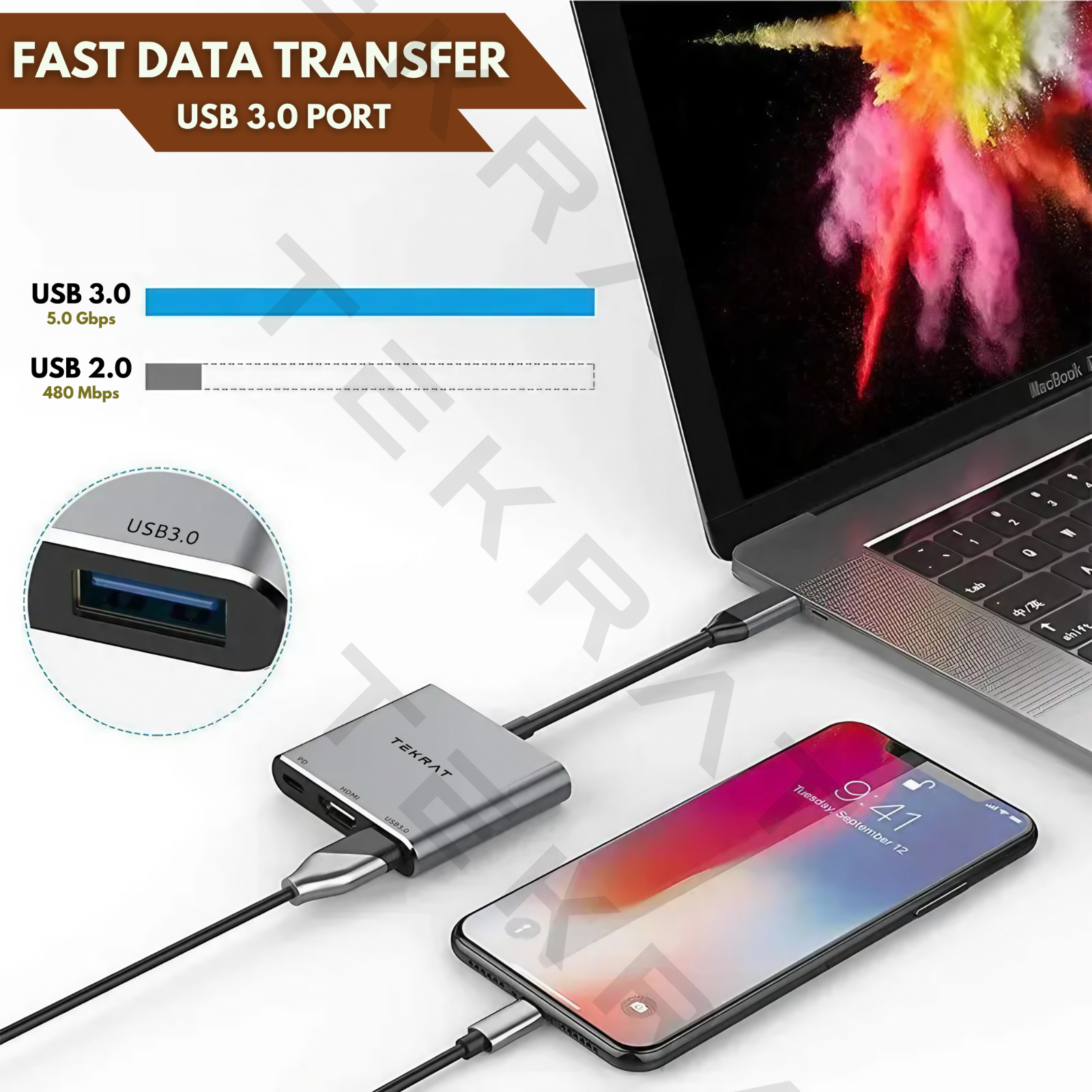 Upgrade your MacBook or any USB-C device with the TEKRAT 3-in-1 Multiport Hub – the ultimate compact solution for work, entertainment, and travel. One sleek adapter unlocks charging, data transfer, and stunning 4K display in seconds.