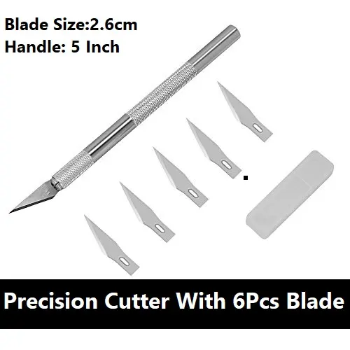 Precision Knife-These WLXY-9309 Aluminum Precision Knife Curving Knife with extra 5Blades ismulti functional and compact. Adopting high strength aluminum materialasitsmain body and handle, it is sturdy and durable, uneasy to deform and get rusty. Featuring with high strength and strongtexture,itcan support heavy impactandisalso workable for extreme hard objects. Coming with five blades, it is economical and practical. In addition, designed intorotatablehead, it is easy to pull outbladefor replacing a new one. The blades are sharp and durable for long time use. Come on and never hesitate!