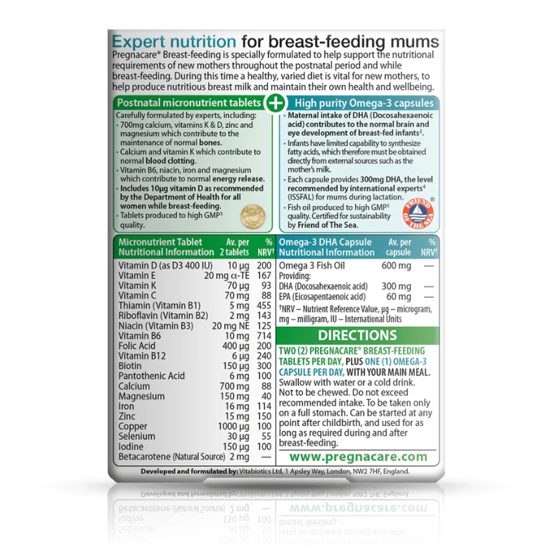 Vitabiotics Pregnacare Breast-Feeding is an advanced postnatal supplement designed to support the increased nutritional needs of breastfeeding mothers. This carefully formulated supplement provides essential vitamins, minerals, and Omega-3 DHA to help maintain maternal health and support the healthy development of your baby.