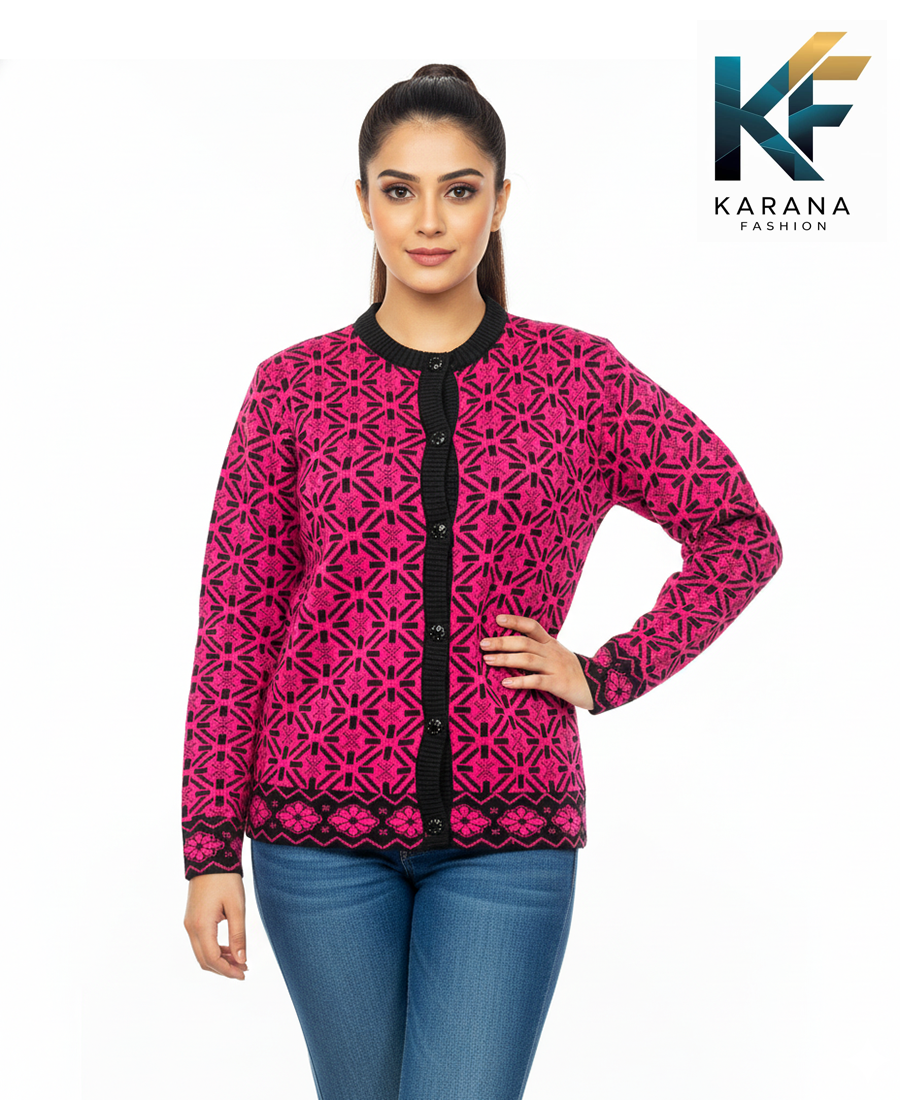 • Pattern: It features a detailed geometric or fair isle-style pattern in across the background of the body and sleeves.