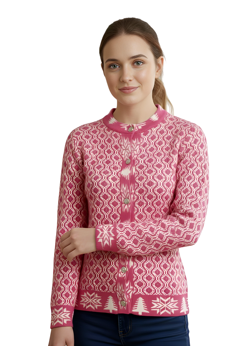• Pattern: It features a detailed geometric or fair isle-style pattern in across the background of the body and sleeves.