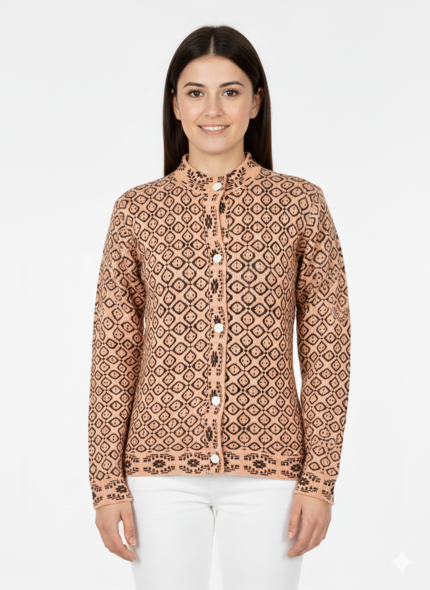 • Pattern: It features a detailed geometric or fair isle-style pattern in across the background of the body and sleeves.