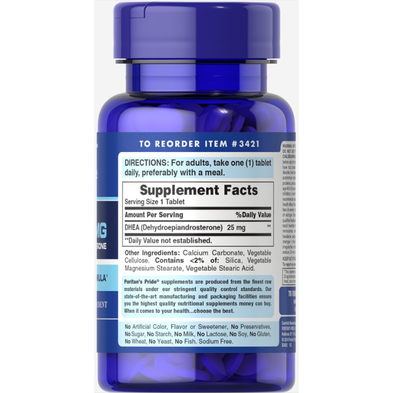 Reclaim youthful energy and maintain hormonal balance with Puritan's Pride DHEA 25 mg, a premium supplement made in the USA. DHEA (Dehydroepiandrosterone) is a hormone naturally produced by the adrenal glands. As we age, the body's DHEA production declines, leading to symptoms like fatigue, mood changes, weight gain, and reduced immunity.