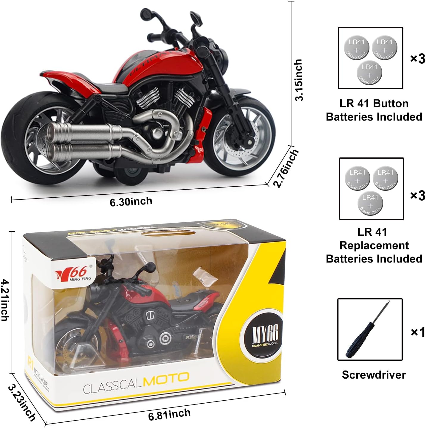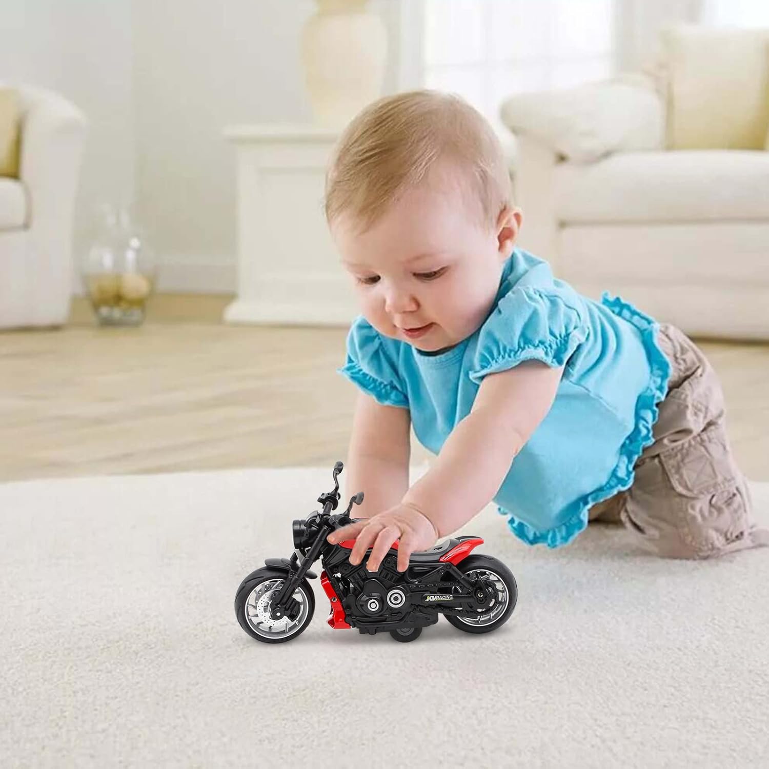 【Pull-Back Motor】 Pull back the motorcycle toy and release it to race at the maximum speed. Kids can play it on the floor table home outdoors and etc.